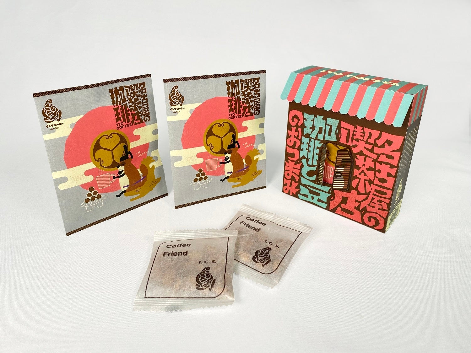 名古屋風のちょっと濃い目の味・喫茶店珈琲ドリップバッグと豆のおつまみ。お家で名古屋の喫茶店が再現できます。レトロ喫茶店を連想させる可愛いパッケージで、お土産にぴったりの商品です。