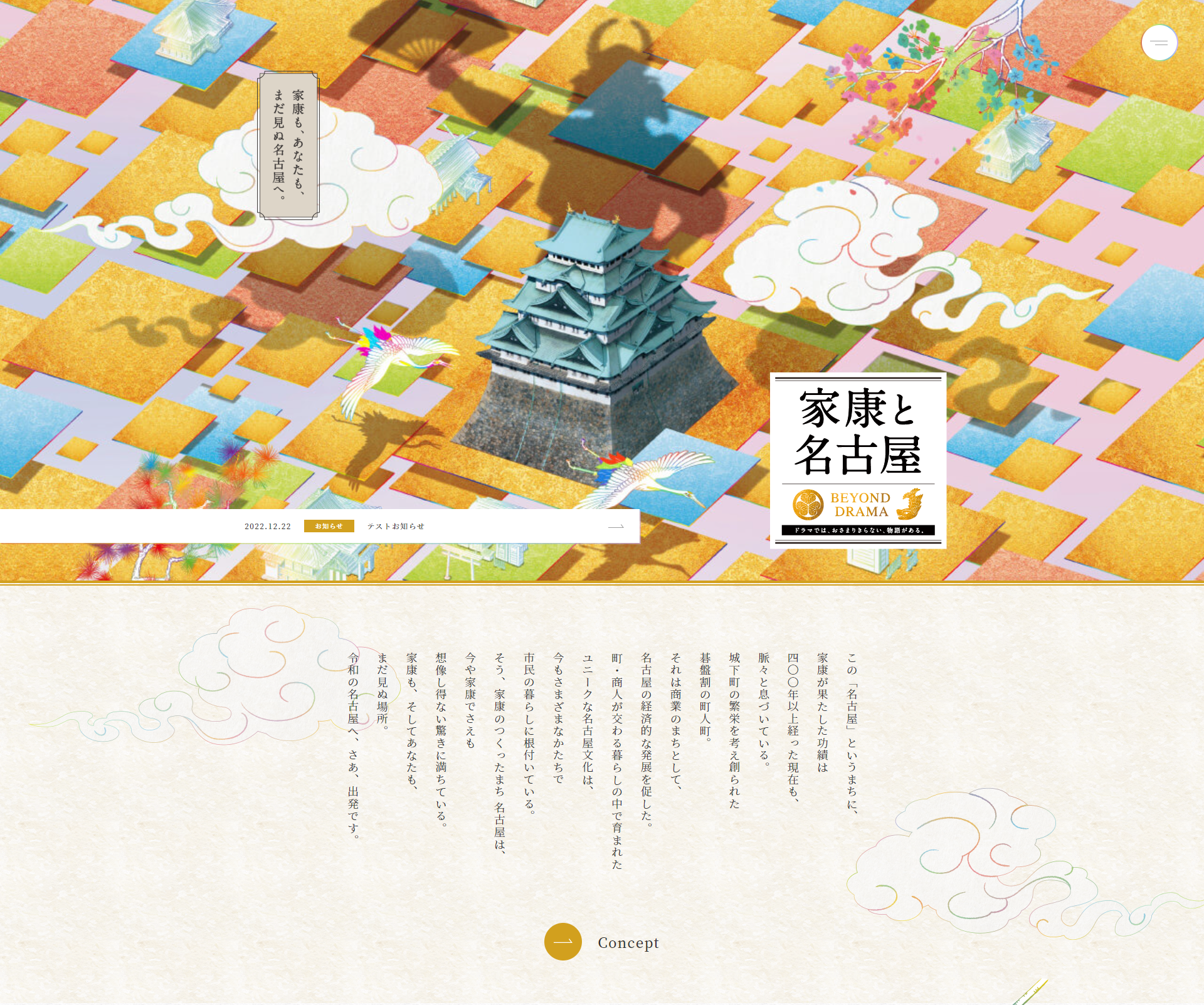 このホームページでは、「家康も、あなたも、まだ見ぬ名古屋へ。」をコンセプトに、徳川家康が造った名古屋のまち、家康ゆかりのスポット、おすすめ観光モデルコース、グルメ・お土産・体験などの観光コンテンツをご紹介します。