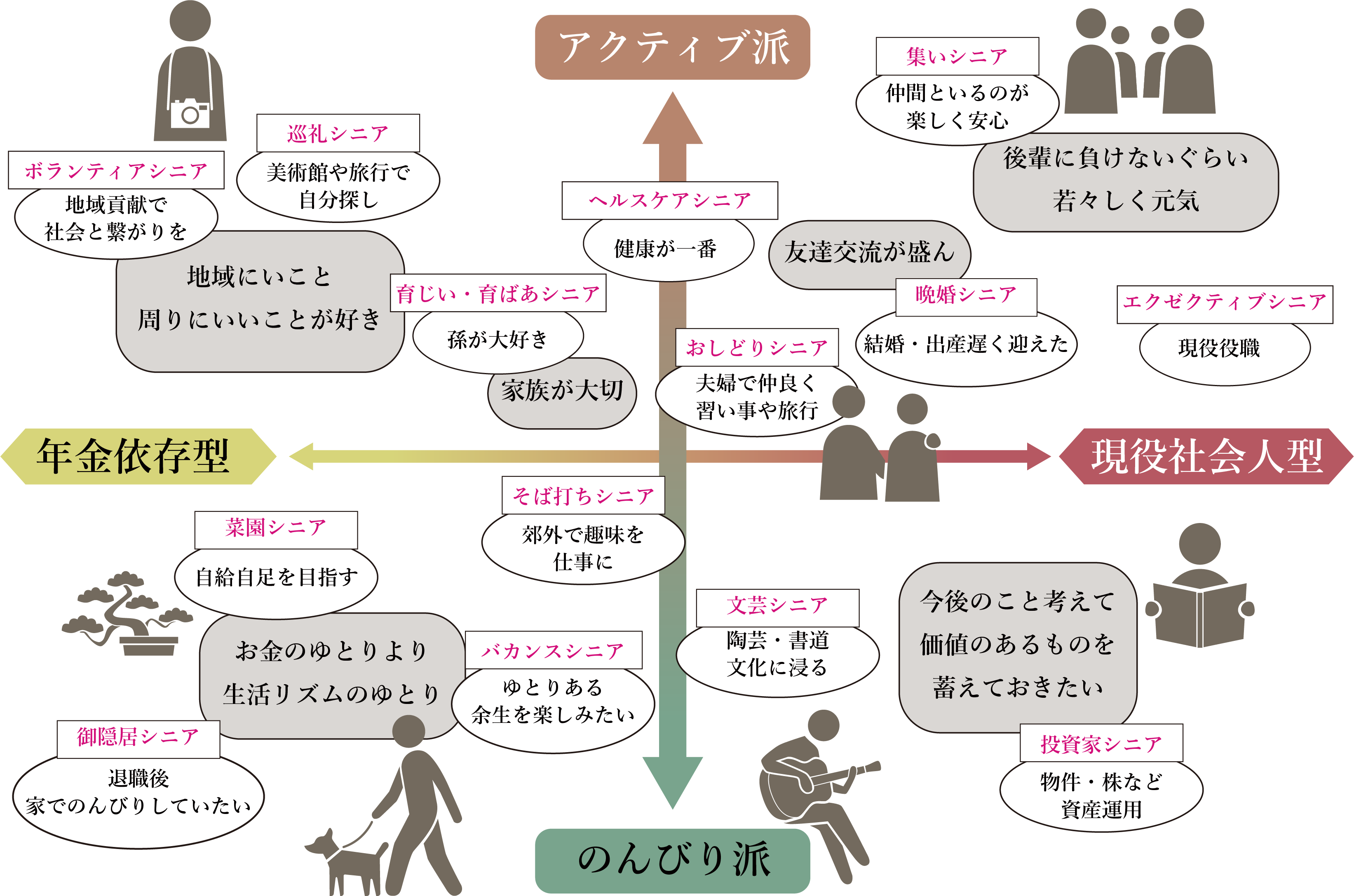 私たちがイメージするこれからのシニア像は、[ 自由人 - 趣味人 - 料理人 - グルマン- 年齢不詳 - ぶらり旅人 - ITコンシャス - スポーツマニア - スタイルコンシャス ]。