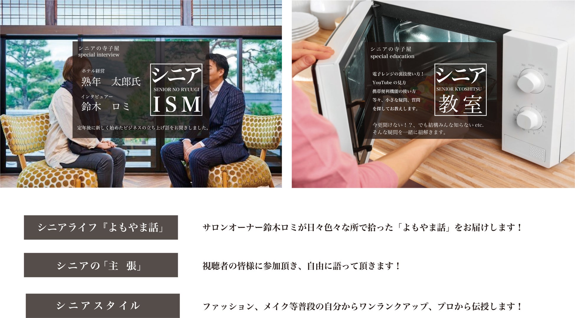 シニアライフにフォーカスしたオンラインサロンを開設します。シニアライフのよもやま話、地域密着型の情報発信、実際に第二の人生を闊歩されているアクティブシニアの方のお話、各界の著名人の方と一緒にシニアライフトーク等々、視聴者の皆様にも参加していただく、『楽してく!為になる!シニアのためのオンラインサロン』です!