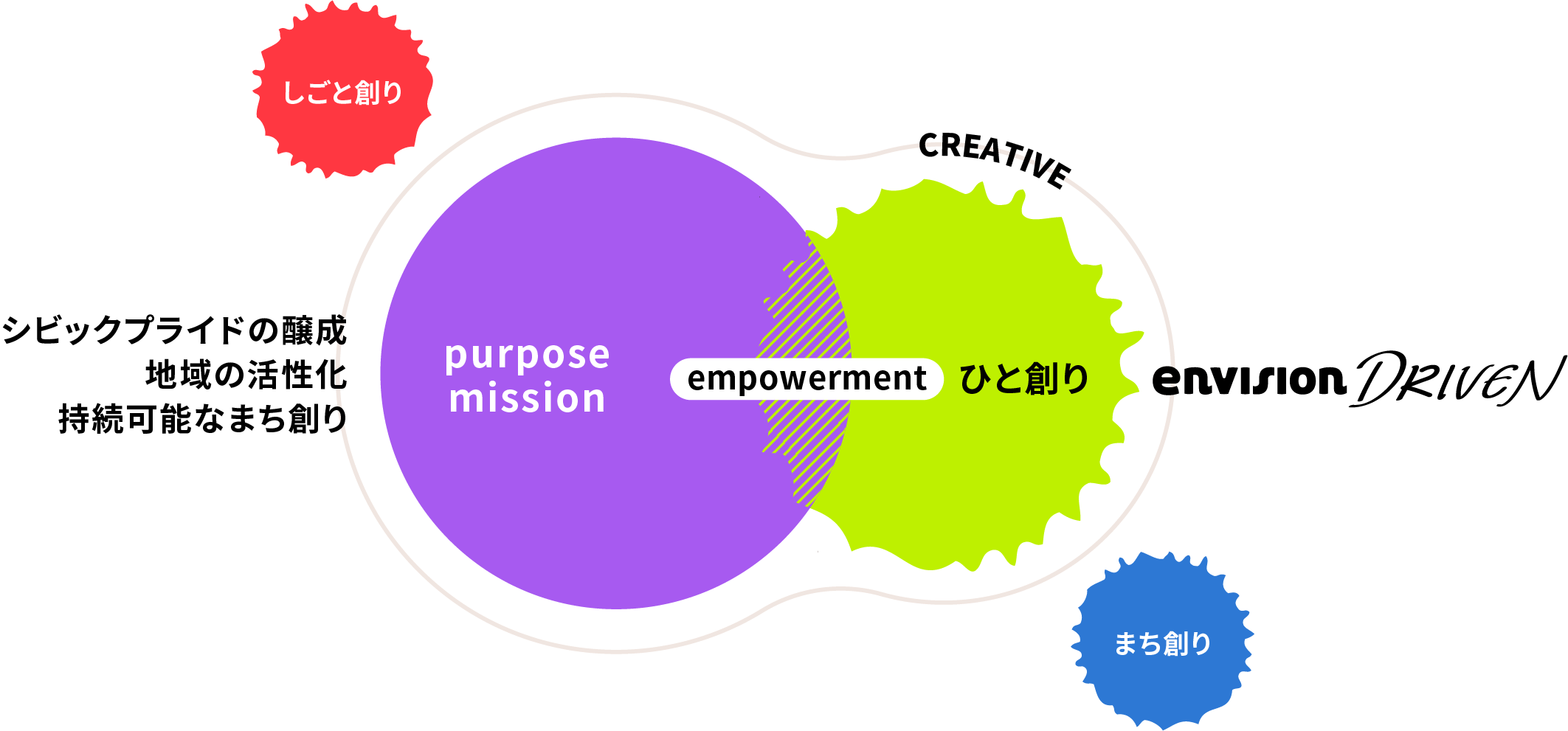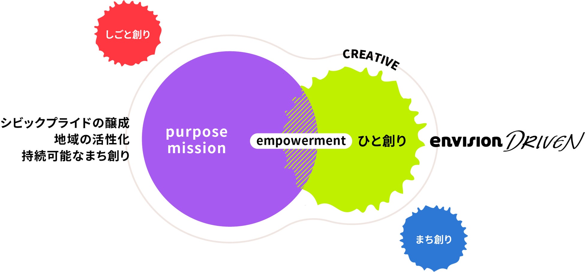 エンビジョンでは、地域に携わる人々や地方自治体と協力し、クリエイティブで日本に新たな価値を生み出す活動「envision DRIVEN」に取り組んでいます。地域住民の力をエンパワーメントすることで、未来を描き、地域から社会を動かす活動です。「envision DRIVEN」は、地方創生の鍵となる「しごと創り」「まち創り」「ひと創り」その中でも「ひと創り」にフォーカスし、クリエイティブの力で地域住民をエンパワーメントしていくプロジェクトです。