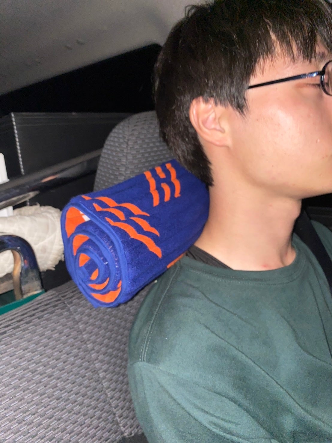 レース中の隙間時間、宿泊先での就寝、遠征移動中の車内で首や腰を枕でストレッチ 身体のメンテナンス