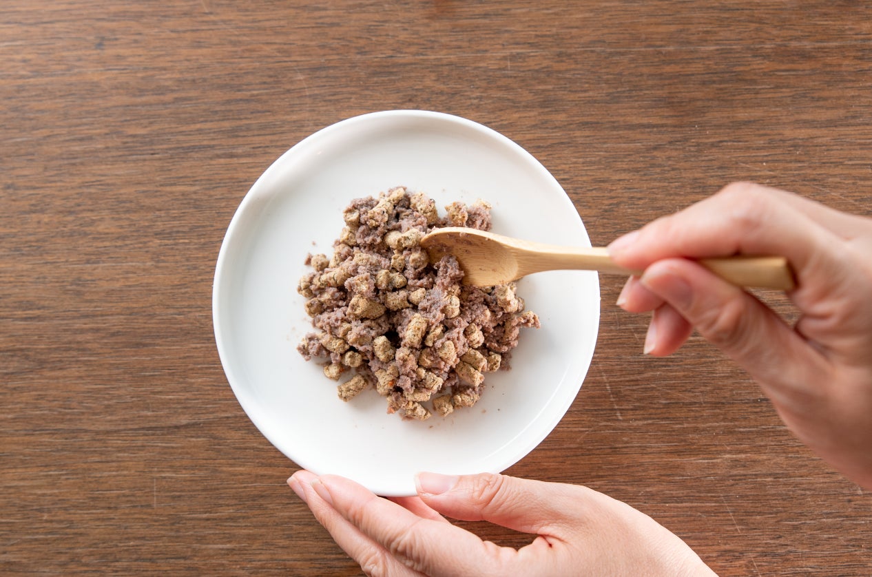 原材料:[肉魚類]鶏胸肉、鶏レバー[雑穀類]米、米ぬか、おから、黒糖、えごま[野菜果物類]にんじん、小松菜、ブロッコリー[その他]鮪油、卵殻カルシウム、ビール酵母、米麹、フェカリス乳酸菌(FK-23)、水