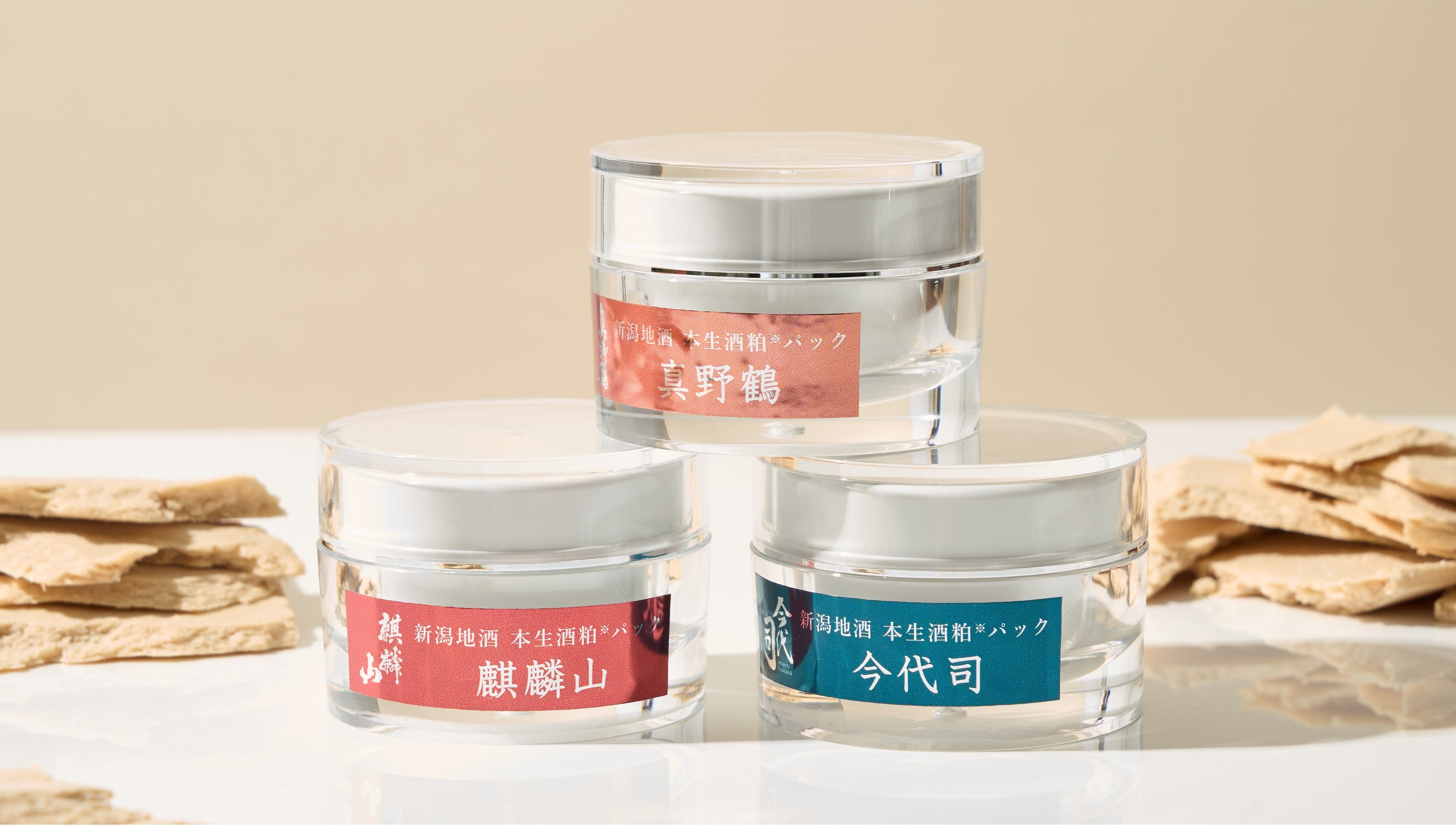 新潟県内の3蔵、今代司酒造(新潟市)のお酒「今代司 純米大吟醸」、麒麟山酒造(阿賀町)のお酒「麒麟山ぽたりぽたり<越淡麗>」、尾畑酒造(佐渡市)のお酒「真野鶴・純米吟醸 朱鷺と暮らす」のそれぞれの酒粕を、エキス化せずに生のまま贅沢に配合した洗い流すタイプのフェイスパック「新潟地酒本生酒粕パック」をマクアケにて先行発売します。
