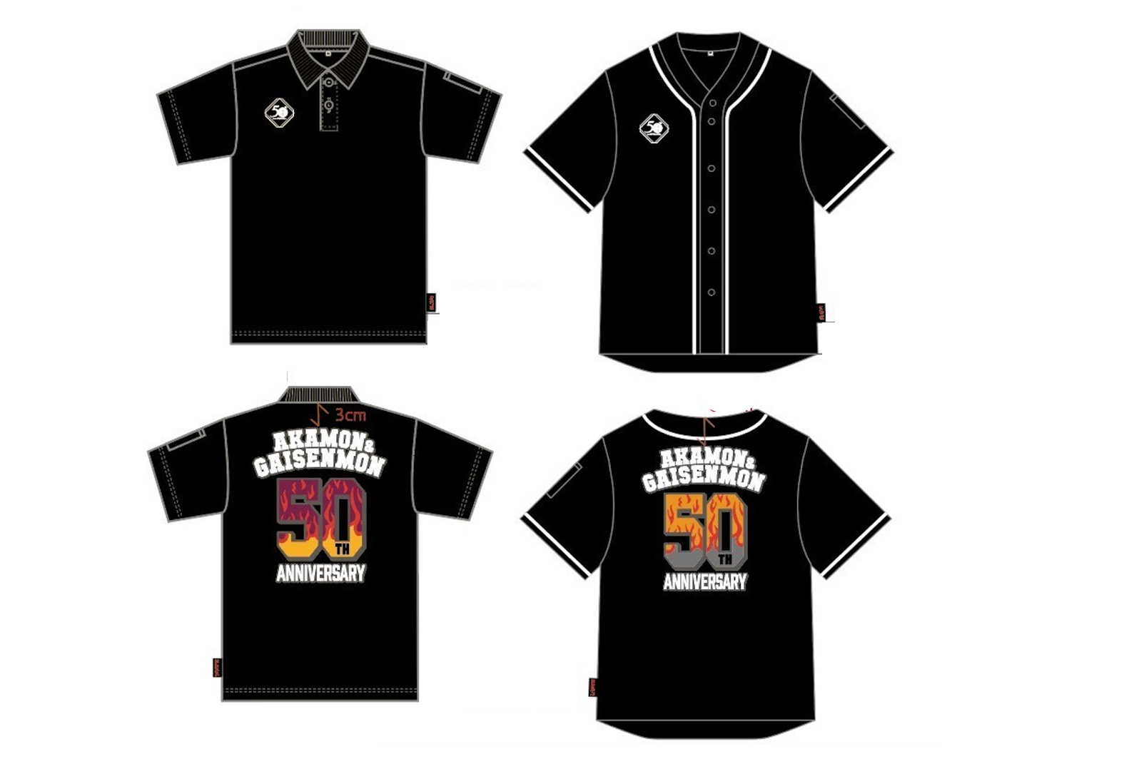 今回創業50周年の節目に制服をリニューアルすることで改めてこれまで応援してくださったお客様への感謝の気持ちと、チームの一体感を今後より高めていきたいという思いからスポーツユニフォームのようなイメージでプリントのデザインを背番号のように施し、ベースボールシャツ(赤門用)とポロシャツ(凱旋門用)を製作しました。背番号の「50」を記載したデザインは、焼肉の炎のイメージを表現し、赤門のコーポレートカラーである黄色と赤を入れました。