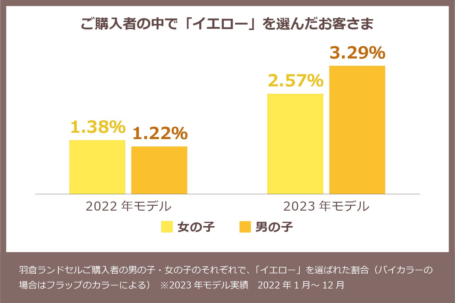 羽倉の2023年モデルでも、男の子は「ブラック系」、女の子は「パープル系」が人気のカラーですが、変化も起きています。2022年モデルと比べて、男の子・女の子とも「イエロー」を購入されるお客さまが増え、女の子は約1.86倍、男の子は2.69倍になりました。いわゆる「”男の子に人気の色”や”女の子に人気の色”から選ぶ」という、固定観念が薄れつつあるようです。