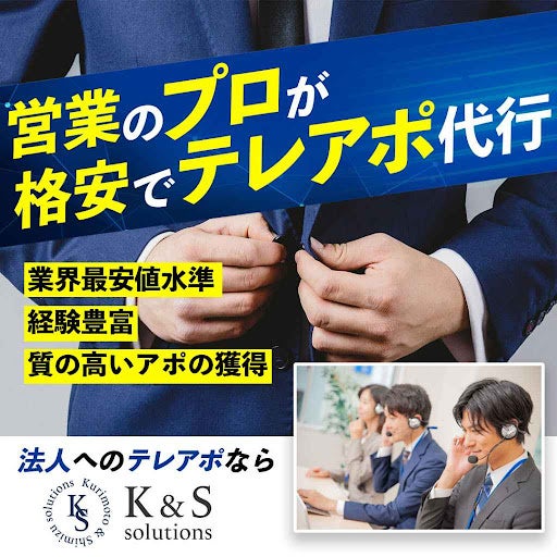 K&Sソリューションズは、大手金融・IT企業で新規営業を経験し、成果を上げてきたメンバーが在籍しています。同社のテレアポ代行サービスは、量より質を重視し、組織の生産性向上と受注率を担保するアポイント獲得を実現しています。上場企業から中小企業、スタートアップ企業まで、幅広い企業の営業支援を行っています。