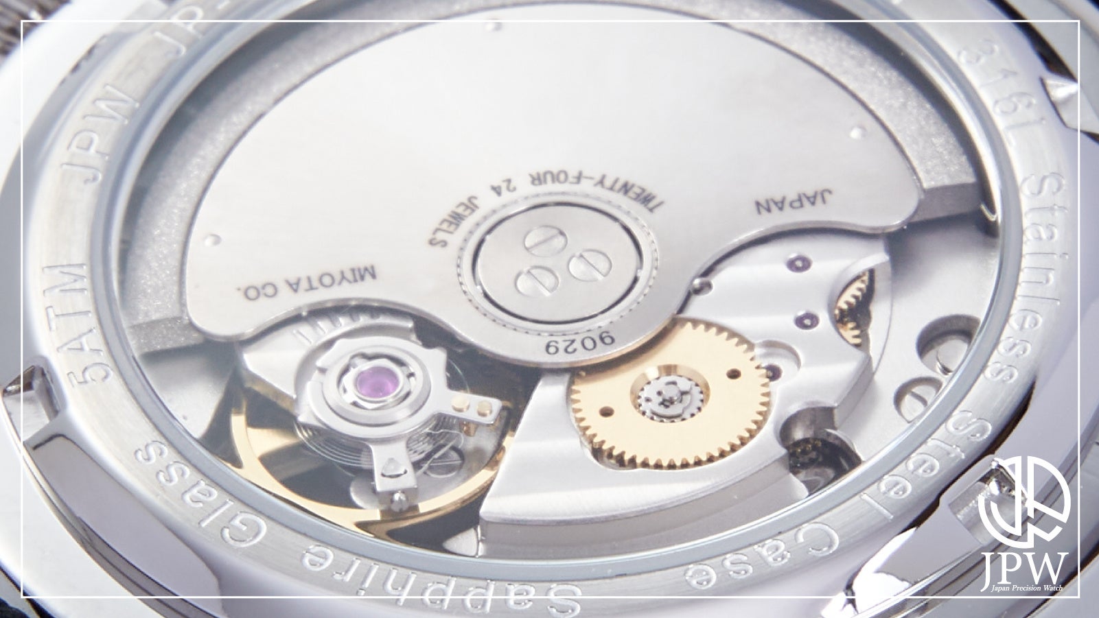 【ムーブメント】MIYOTA Cal.9029 (秒針停止機能/自動巻き+手巻き/2針) / 日差:-10~+30 秒 / 駆動時間:42 時間(最大巻上時) / 振動数:28800 回/時 / 石数:24石