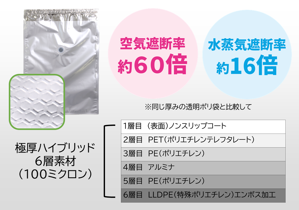 『極厚 米ガード』は、15年以上に渡り玄米用の保冷庫を企画・販売してきた当社と、「布団圧縮袋」の業界トップクラスのシェア率を誇る株式会社オリエント様とで共同開発した、お米のための保存袋です。「真空密閉」「無酸素」「光遮断」というお米の保存に必要な要素を揃え、常温での長期保存を可能にしました。