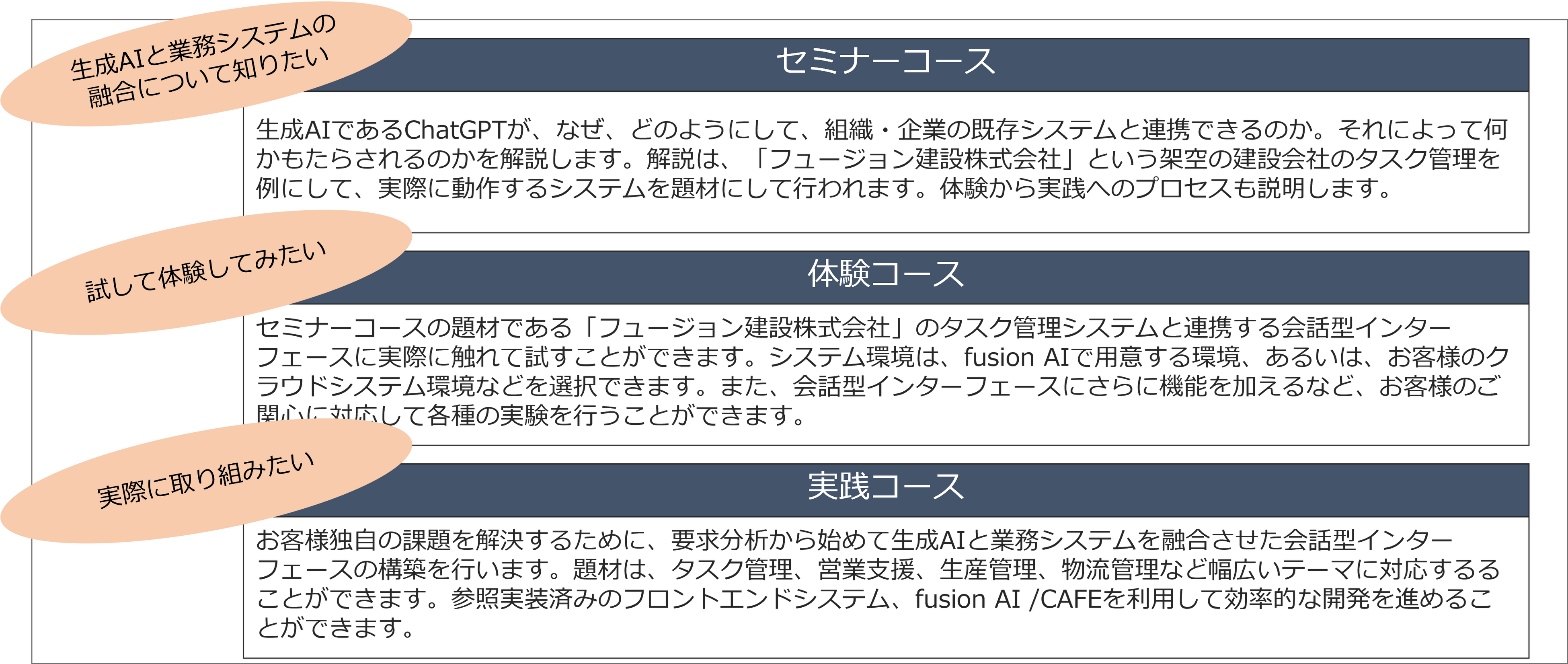 セミナーコースでは、fusion AIの進め方を、目的、効果、プロセス、技術の観点から説明しますので、体験コースや実践コースの詳細についてあらかじめ知ることができます。