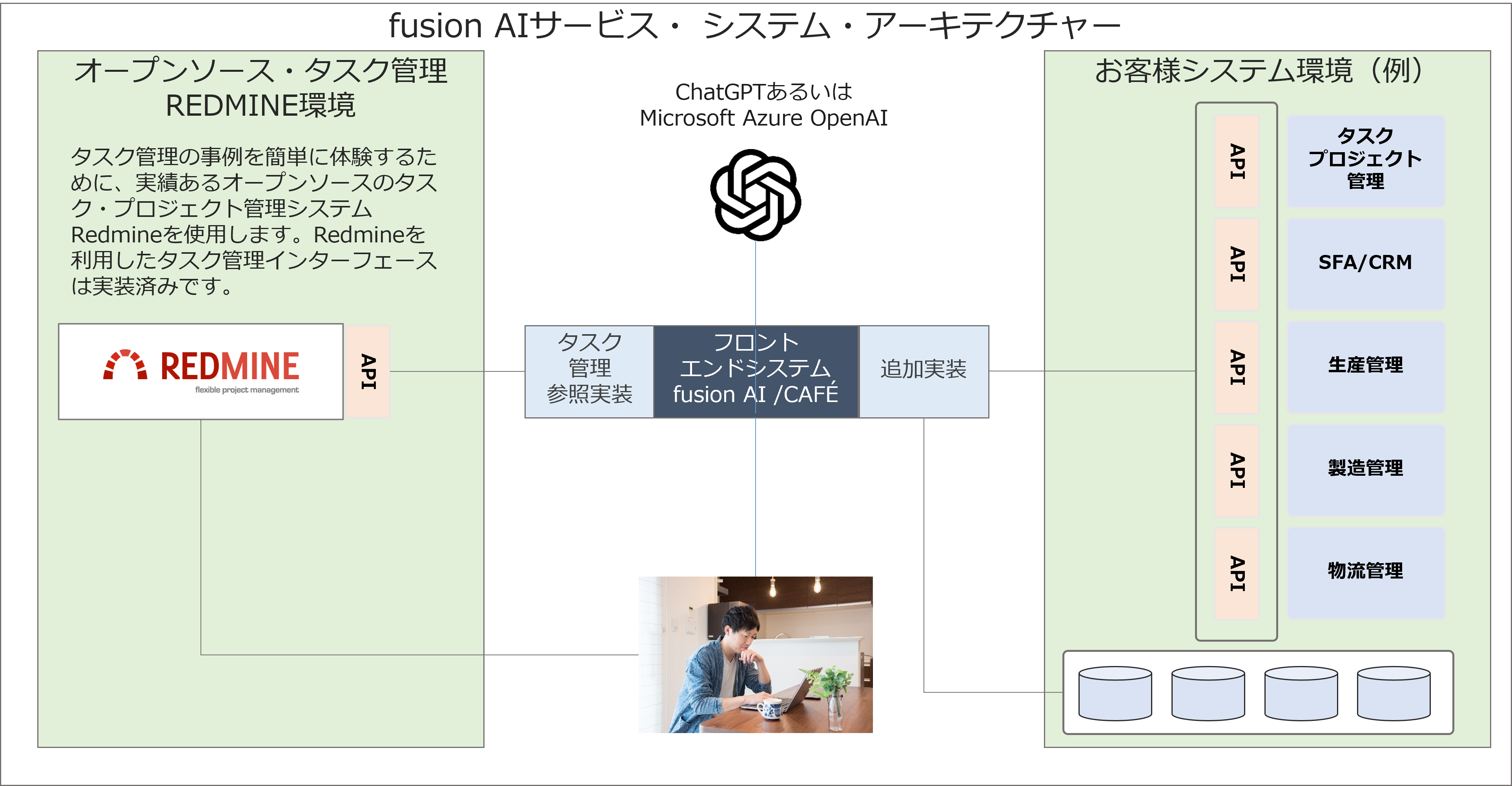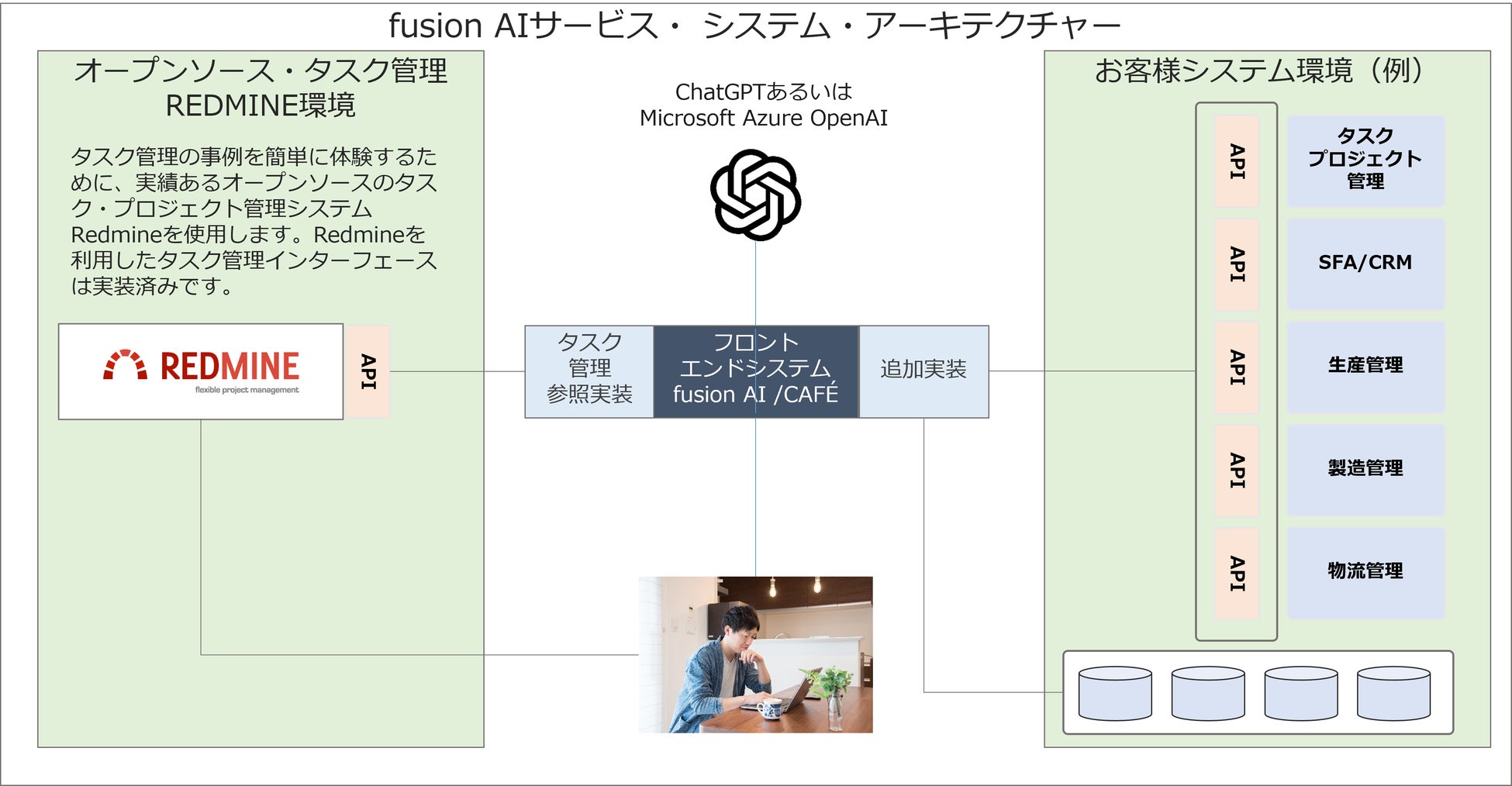 業務システムとの連携のためには、通常は業務システム側にAPI(アプリケーション・プログラミング・インターフェース)が必要ですが、fusion AIサービスとしてそのAPIの開発を行うこともできます。