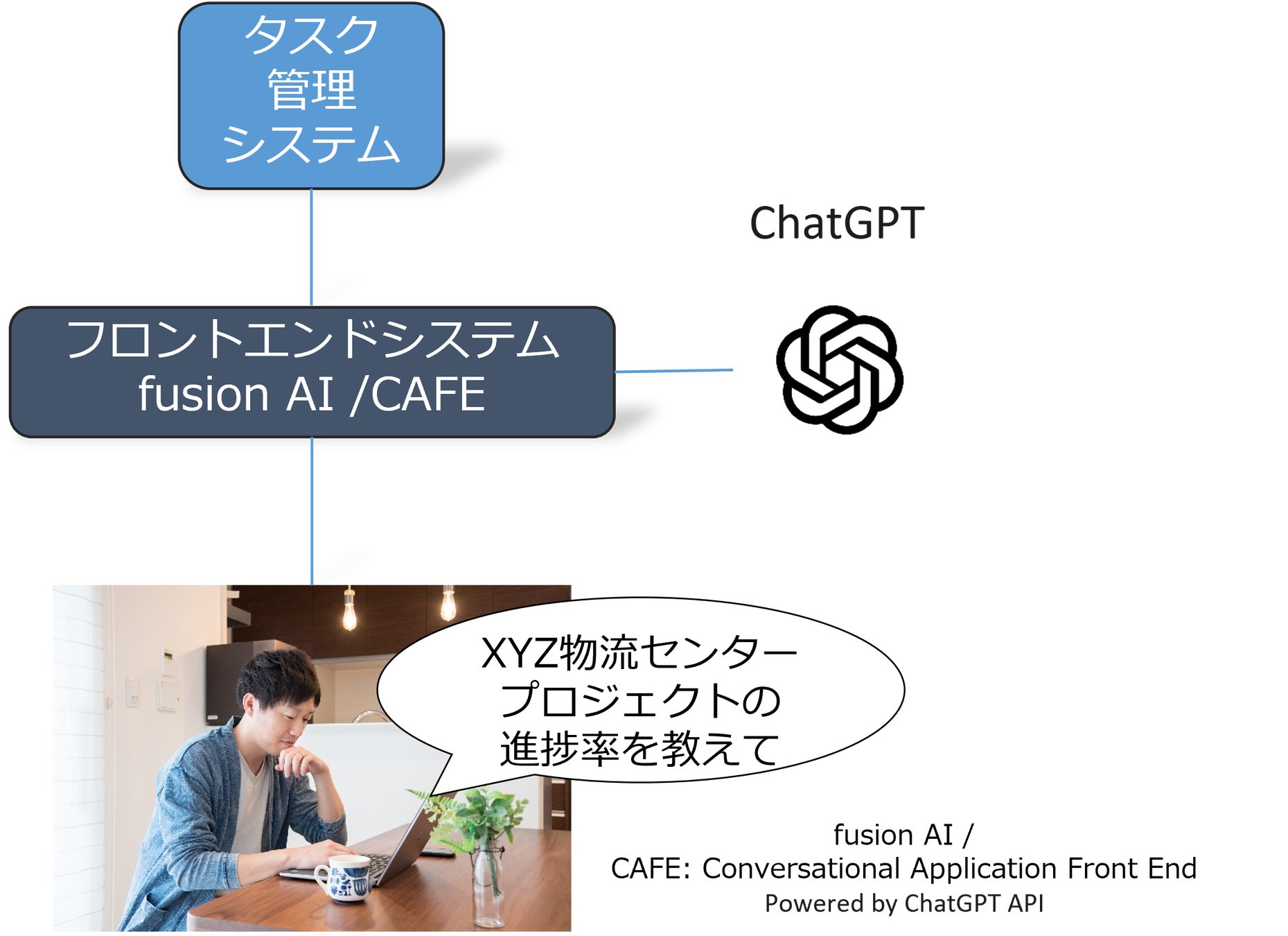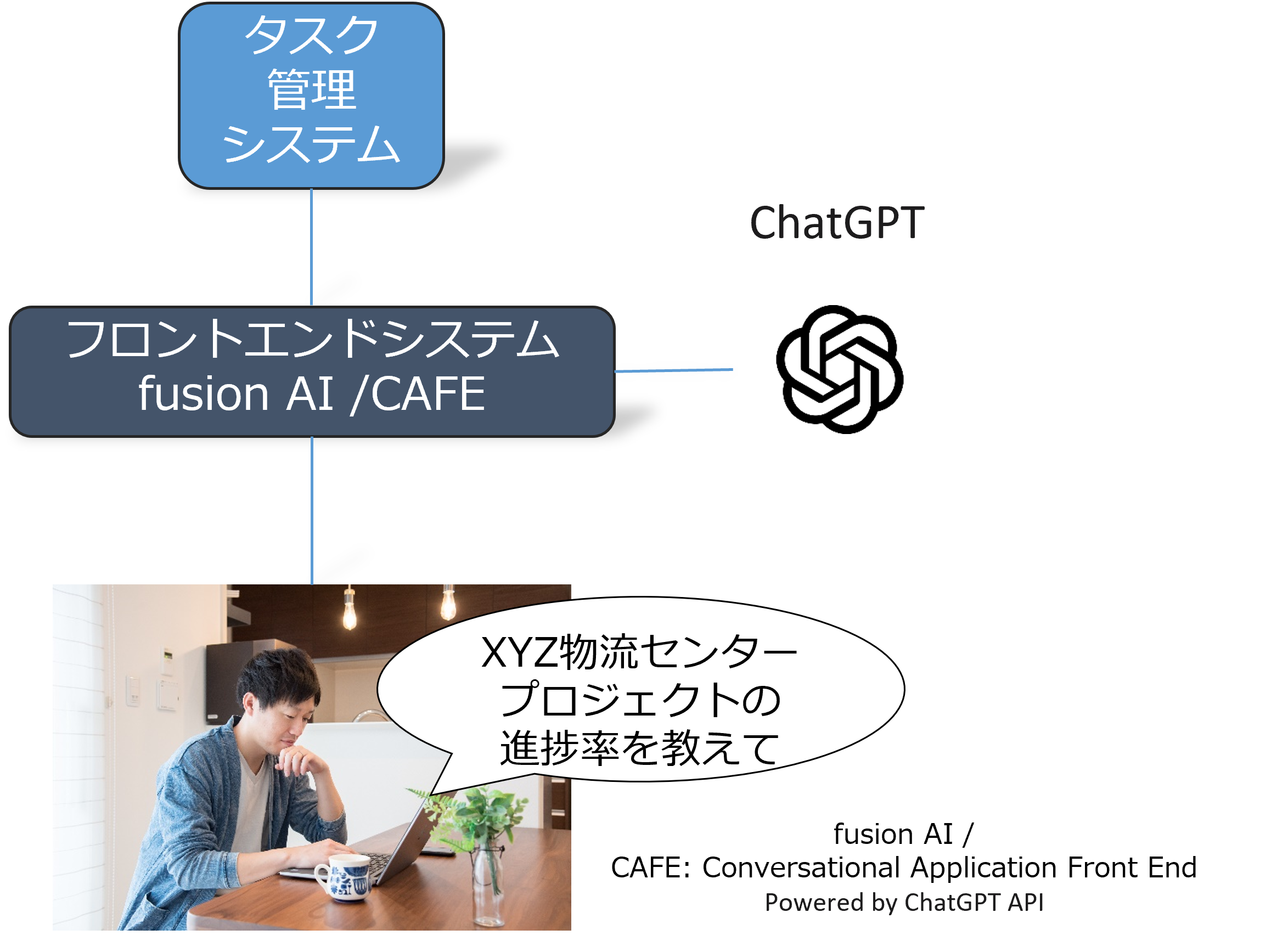 業務の例としてプロジェクト管理の場合、経営者なら「XYZ物流センタープロジェクトの進捗率を教えて」とか、部門管理者なら「今月忙しい人を一覧表でみせて」のように、自分の発想や関心に沿った自然な語彙を用いて自然言語インターフェースに話しかけ、結果を手にすることができます。以下の図は、ChatGPTと連携するタスク管理システムに対して、経営者が自然言語で問いかけている様子です。