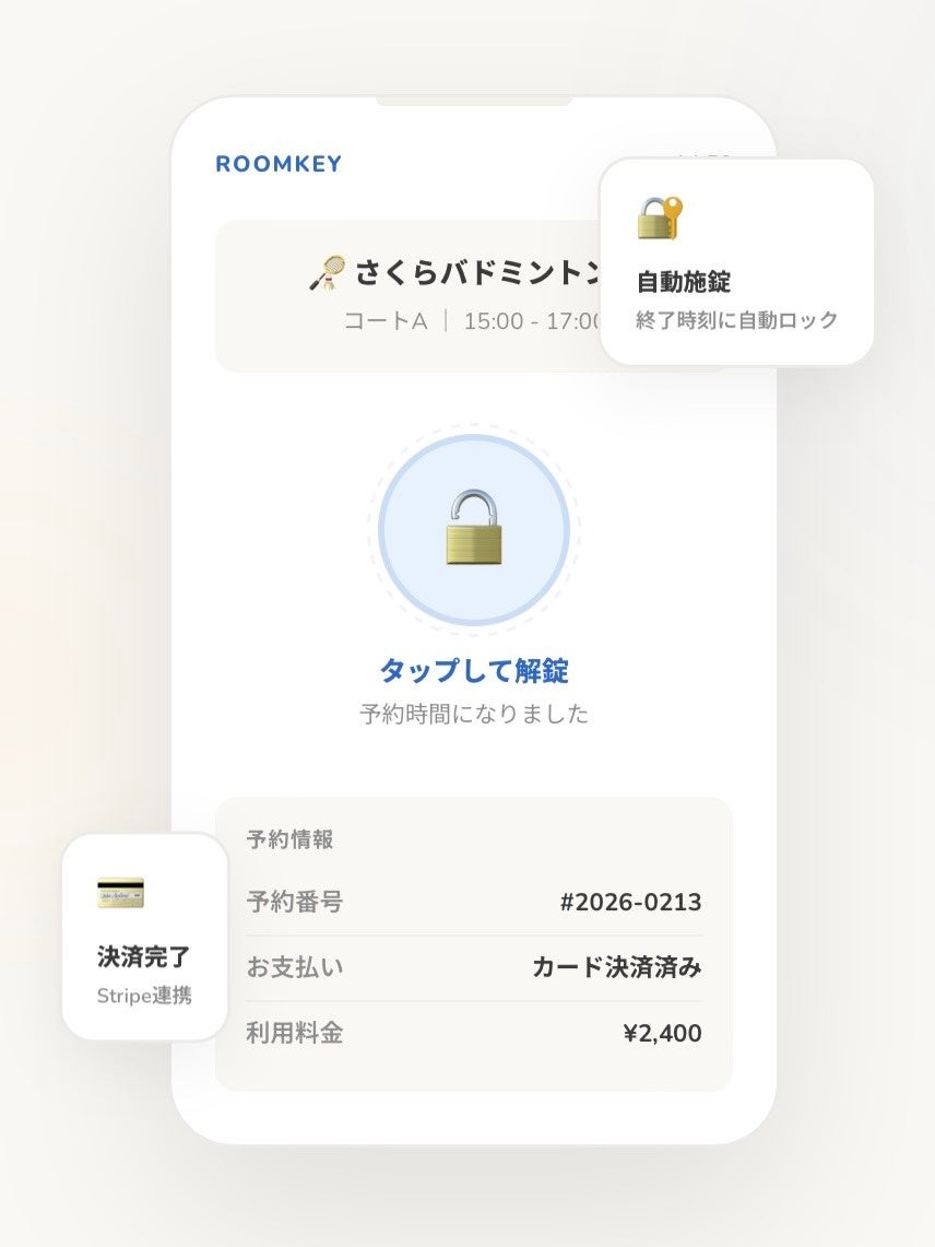 ROOMKEYは、予約・決済・スマートロック連携・売上管理を一元化し、施設の無人運営をシンプルに実現する無人運営プラットフォームです。