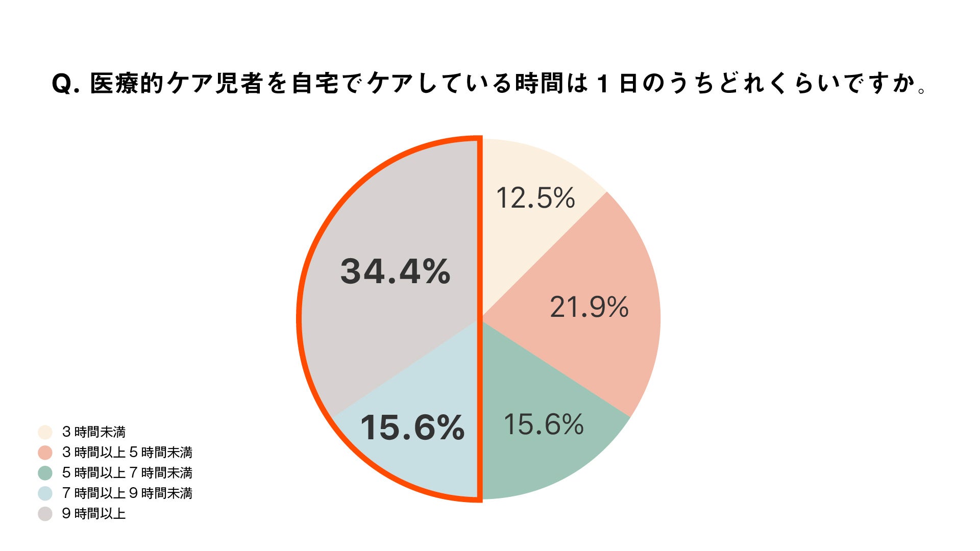 一日のうち、自宅で医療的ケア児のケアをしているのは「7時間以上」と回答した人が半数でした。さらに、3人に1人が「9時間以上」と回答しており、家庭内での負担が大きいことがうかがえます。