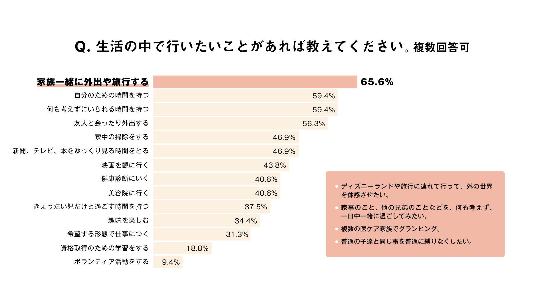 生活の中で行いたいことを聞くと、最も多かったのが「家族と一緒に外出や旅行をする」で65.6%でした。「ディズニーランドや旅行に連れて行って外の世界を体感させたい」「複数の医ケア家族でグランピングしたい」といったコメントが寄せられました。きょうだい児のいる家庭も多く、家族で一緒に出掛けたいというニーズが高いようです。