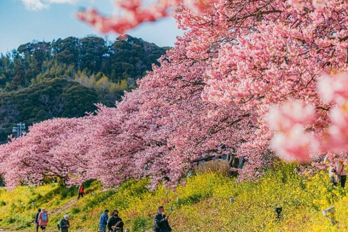 「河津桜」の誕生の地である静岡県賀茂郡河津町で開催される「河津桜まつり」は、毎年、全国からたくさんの観光客が集まる伊豆の一大イベント。町内を流れる河津川沿いに植えられた約850本の河津桜が咲き乱れ、同じ時期に川沿いに植えられた菜の花も開花。河津桜の濃いピンク色と、菜の花の黄色の花との共演は、訪れる人の心を魅了します。