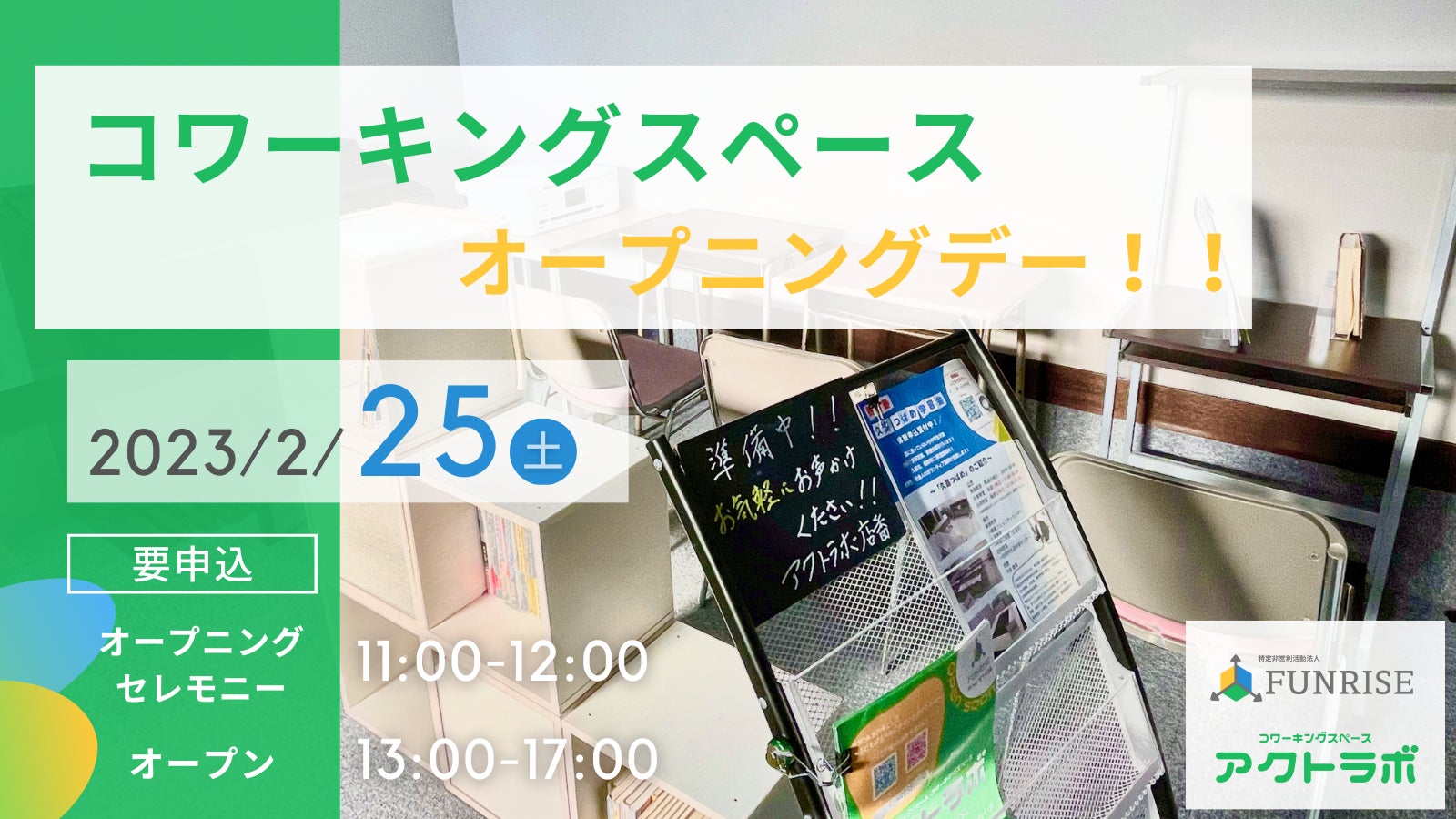 NPO法人FUNRISE(埼玉県久喜市本町5丁目4-30 塩崎コーポ店舗・事務所)は2/25(土)埼玉県久喜市にコワーキングスペース「アクトラボ」をオープンします。初日となる2/25にはオープニングセレモニーを行います。セレモニーの参加申込、コワーキングスペースの座席予約の受付を開始しました。
