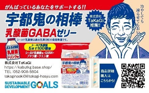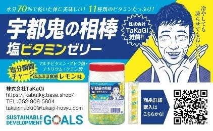 現場の相棒シリーズの販売代理店で、コンクリート補修やエクステリアの施工を行う建設会社である株式会社TaKaGi(本社:名古屋市)がお笑い芸人の「おさる」こと、書道家としても活躍中の「宇都鬼(ウッキー)」を現場の相棒アンバサダーに認定し、2023年1月より「宇都鬼の相棒 乳酸菌GABAゼリー」を発売。また2023年5月には「宇都鬼の相棒 塩ビタミンゼリー」を発売する予定。購入は「宇都鬼の相棒 公式BASE SHOP」にて可能。(https://kabutkg.base.shop)