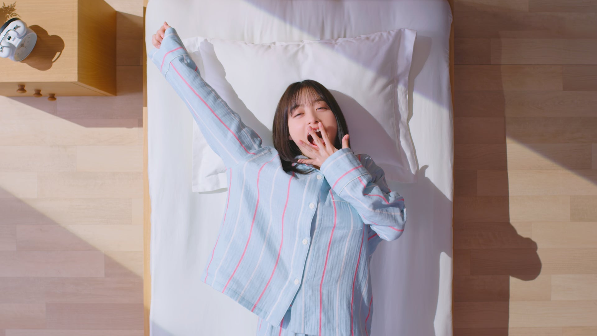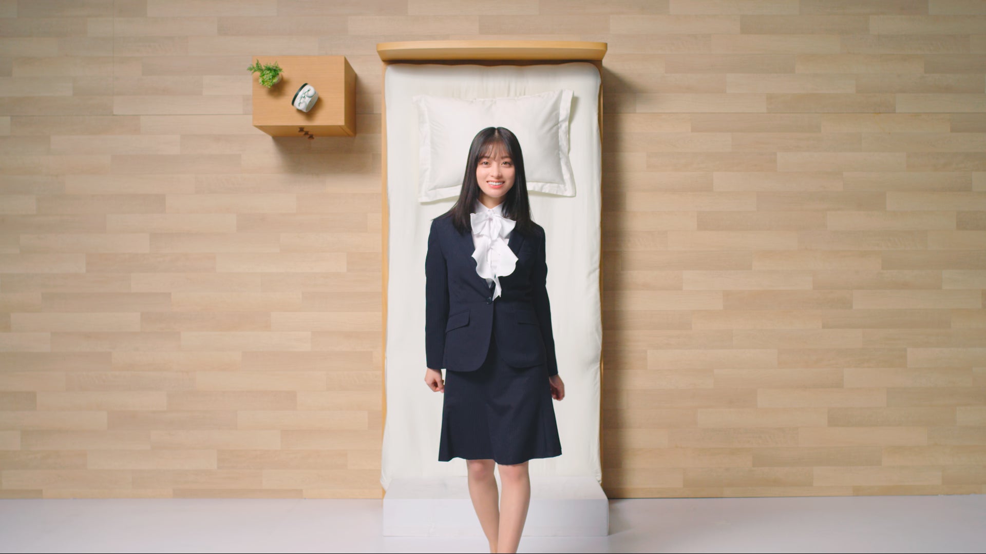オープニングでの環奈さんの寝顔からカメラが引いて一気に場面転換し、ジャンプに合わせて環奈さんの衣装がスーツスタイルにチェンジしていきます。ジャンプのタイミングで一気に着替えたり、違う衣装を着た3人の環奈さんが画面に並んだりするため、環奈さんには衣装を変えながら何回も同じ動きをしていただきましたが、環奈さんの振り付けが本当にピッタリ揃っていて、「こんなに揃ってたんだ!」とシンクロ率の高さにご自身でもビックリされていました!