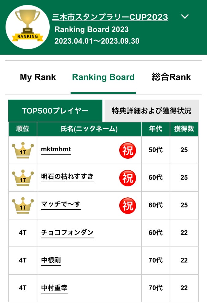 ②総合ランキング(個別イベント開催コースのみ2回目以降の押印が可能。最大6コース。)