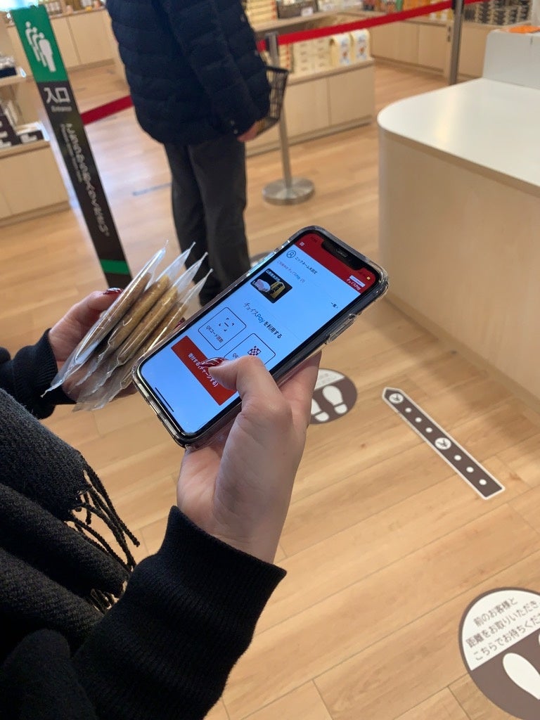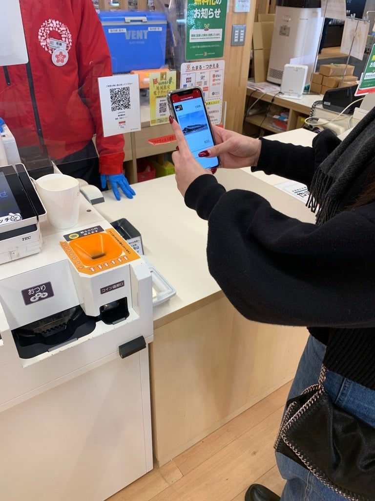 商品を選んだら、お店のレジに掲示されたQRコードを、専用のアプリから読み取り決済を行います。