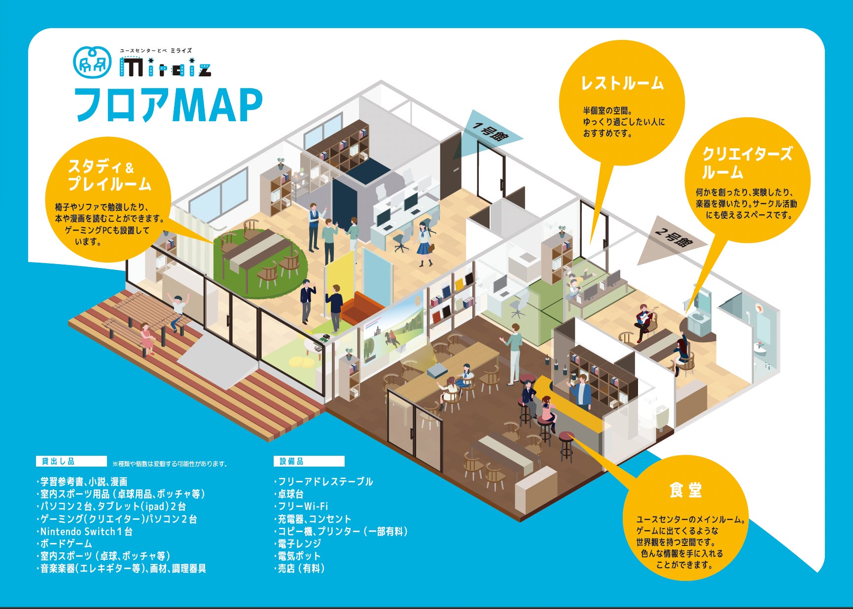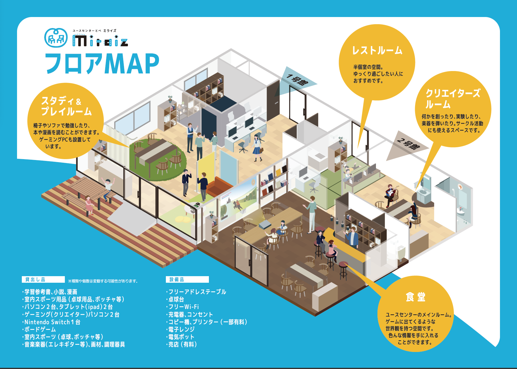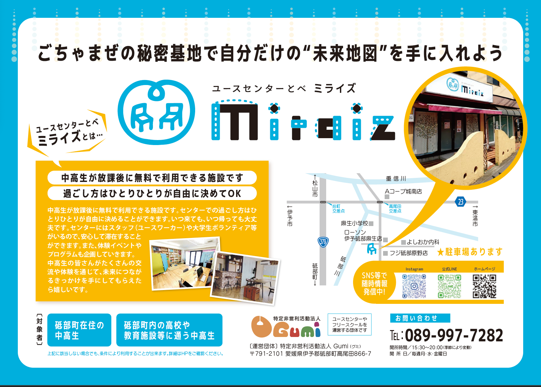 特定非営利活動法人Gumiでは、自宅でも学校とも異なる、子どもが主体的に過ごせる放課後から夜間の居場所として、ユースセンターとべmiraiz(以後、ミライズ)をオープンしました。(https://gumi-npo.com)