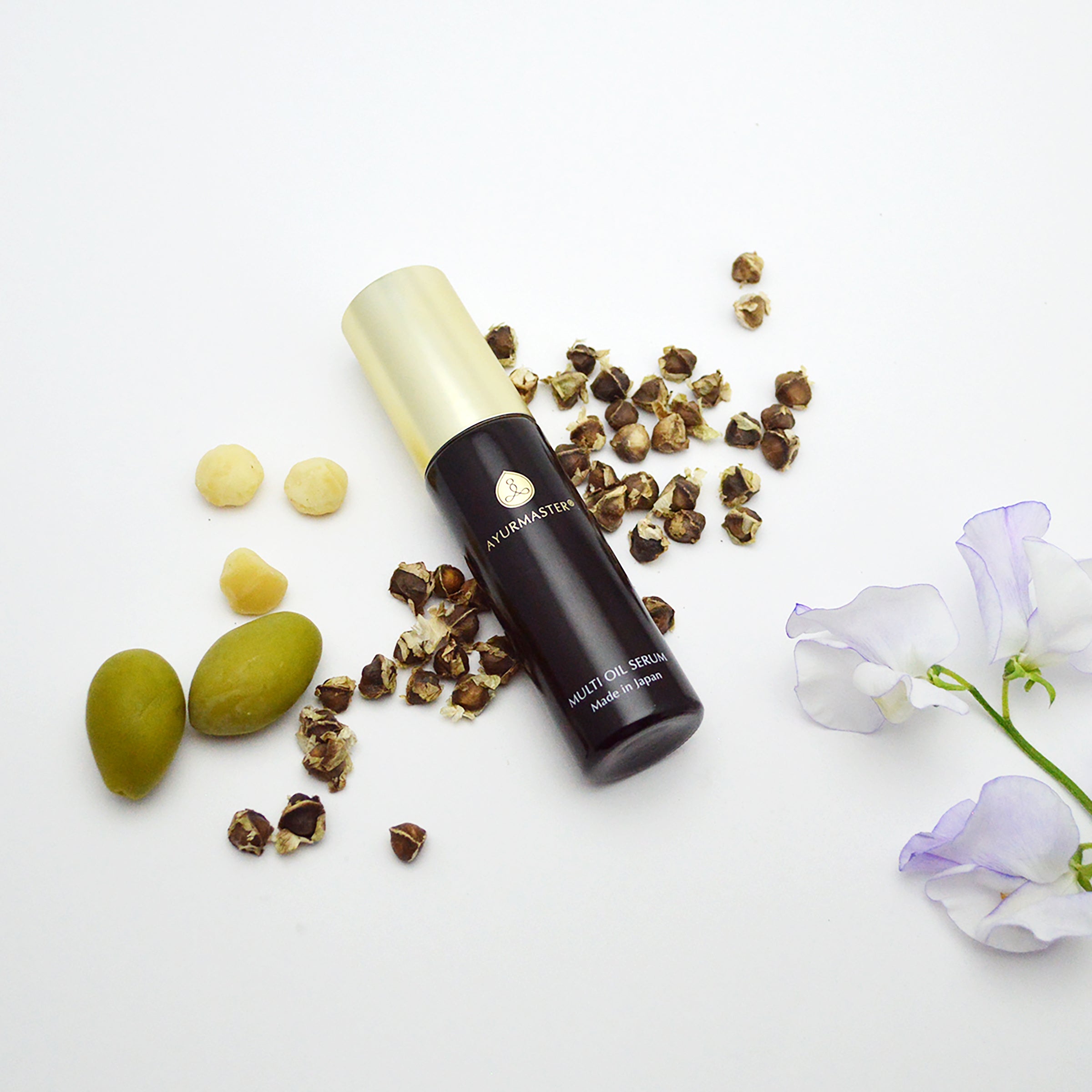 アーユルマスターのマルチオイルはモリンガ種子油を主成分とし、アルガニアスピノサ核油(アルガンオイル)、ホホバ種子油、カニナバラ果実油(ローズヒップ油)、植物由来スクワランなどの機能性が高い高級オイルを使用しています。 酸化しにくいオイルのため紫外線による油焼けが起こりにくく、日中にもご使用いただけます。