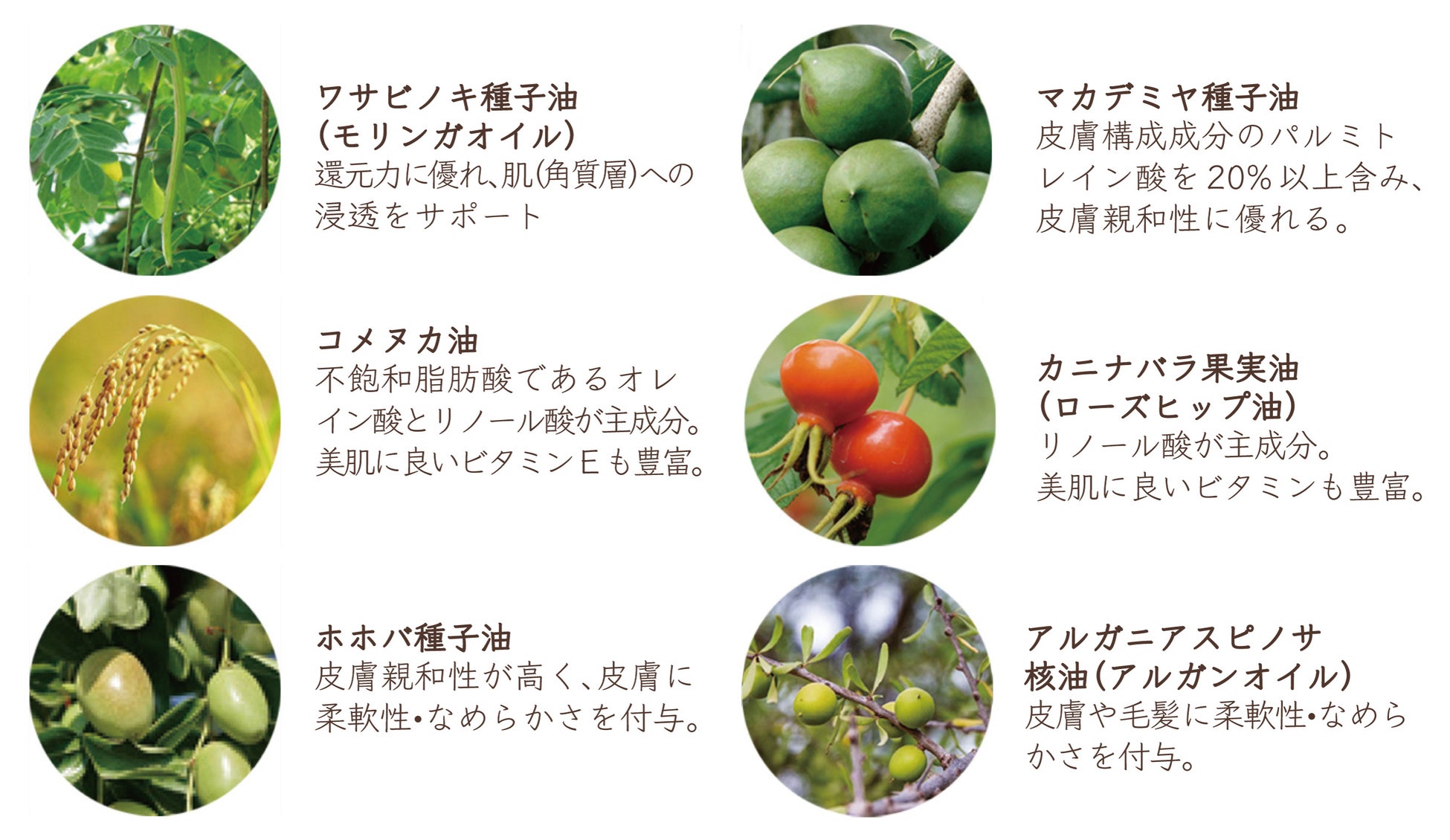 マカデミヤ種子油:皮膚構成成分のパルミトレイン酸を20% 以上含み、皮膚親和性に優れる。