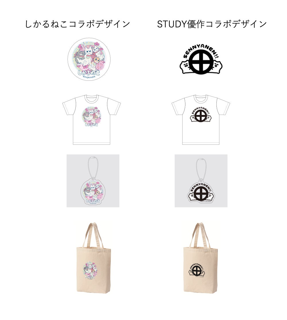しかるねこコラボデザインの複製原画販売、STUDY優作書き下ろし原画(限定3点:原宿で1点、鹿児島で2点販売予定)と複製原画も販売いたします。その他にもアクリルキーホルダーやTシャツ、トートバックや缶バッジなどのグッズも販売いたします。