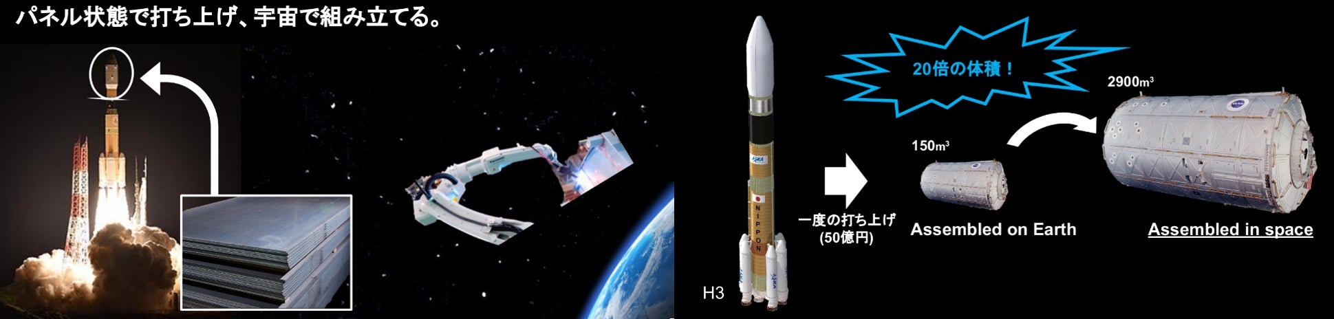 現在、Space Xを中心に宇宙への輸送技術で技術革新が起こっています。そして、2026年には米国民間企業(Axiom Space)による民間宇宙ステーションの運用が始まり、2030年以降NASAの民間宇宙ステーション支援が始まります。こうした動きを背景に、多数の大手企業やスタートアップが、多くの人が宇宙で活動するための大型建造物の建築プロジェクトを進めています。しかし、構想の中には、既存技術のみでは宇宙に輸送可能な構造のサイズ制限、スペースデブリへの安全性の観点などから実現が困難なものも多くあります。