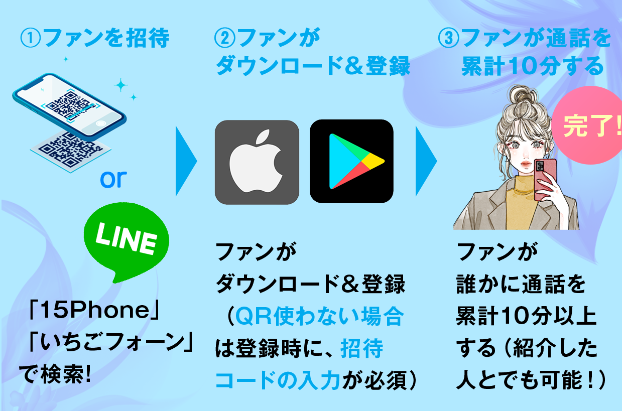- そのファンが15Phoneアプリをダウンロード&登録。▶ファンが、累計10分の通話(招待したキャスト以外でも可)を達成。