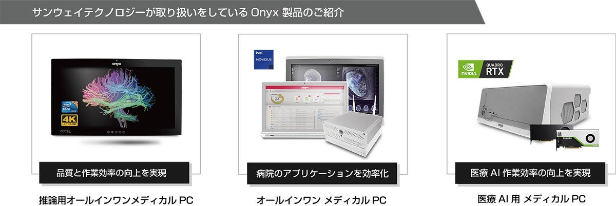 今回の出展では、ASUSグループ傘下の医療機器に特化した産業用PCベンダーであるOnyx Healthcare Inc.の医療用PCソリューションをご紹介します。医療機関での導入において、医療認証取得済(EN 60601-1)の「医療AI用 メディカルPC」がお客様のニーズに合わせてパーツをカスタマイズでき、お客様の環境に最適な構成を提案いたします。