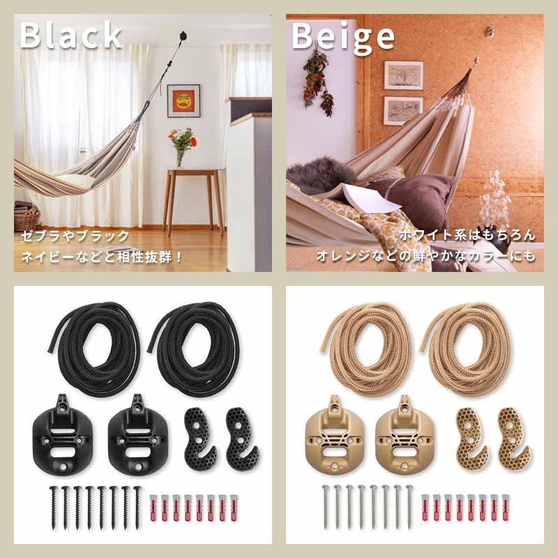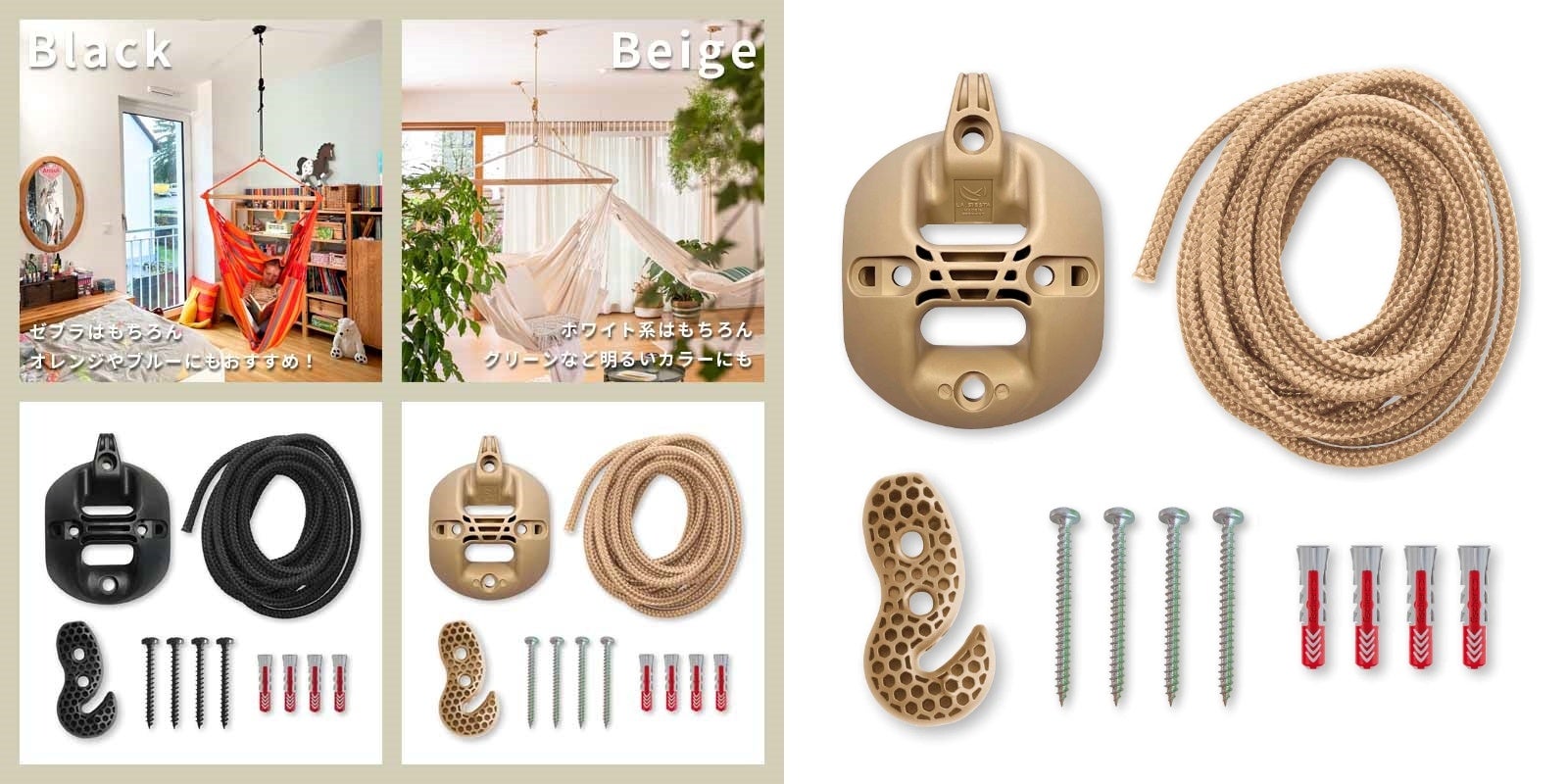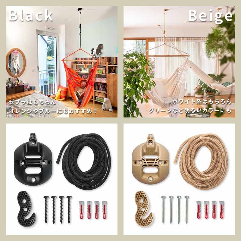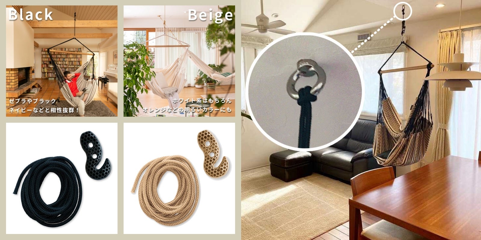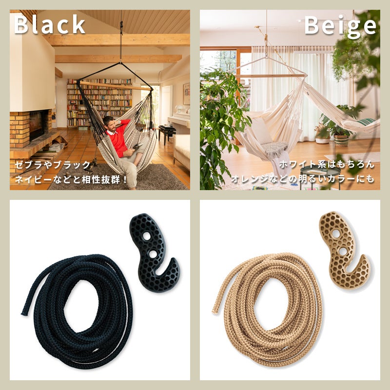 この度、世界で展開されている4点留めの『カーサマウントシリーズ』また、日本限定展開の『ハンモックチェア用 ツリーロープ』に ベージュカラーが登場。ハンモックのカラーや、お部屋のテイストに合わせてブラックとベージュの2色からお選びいただけるようになりました。