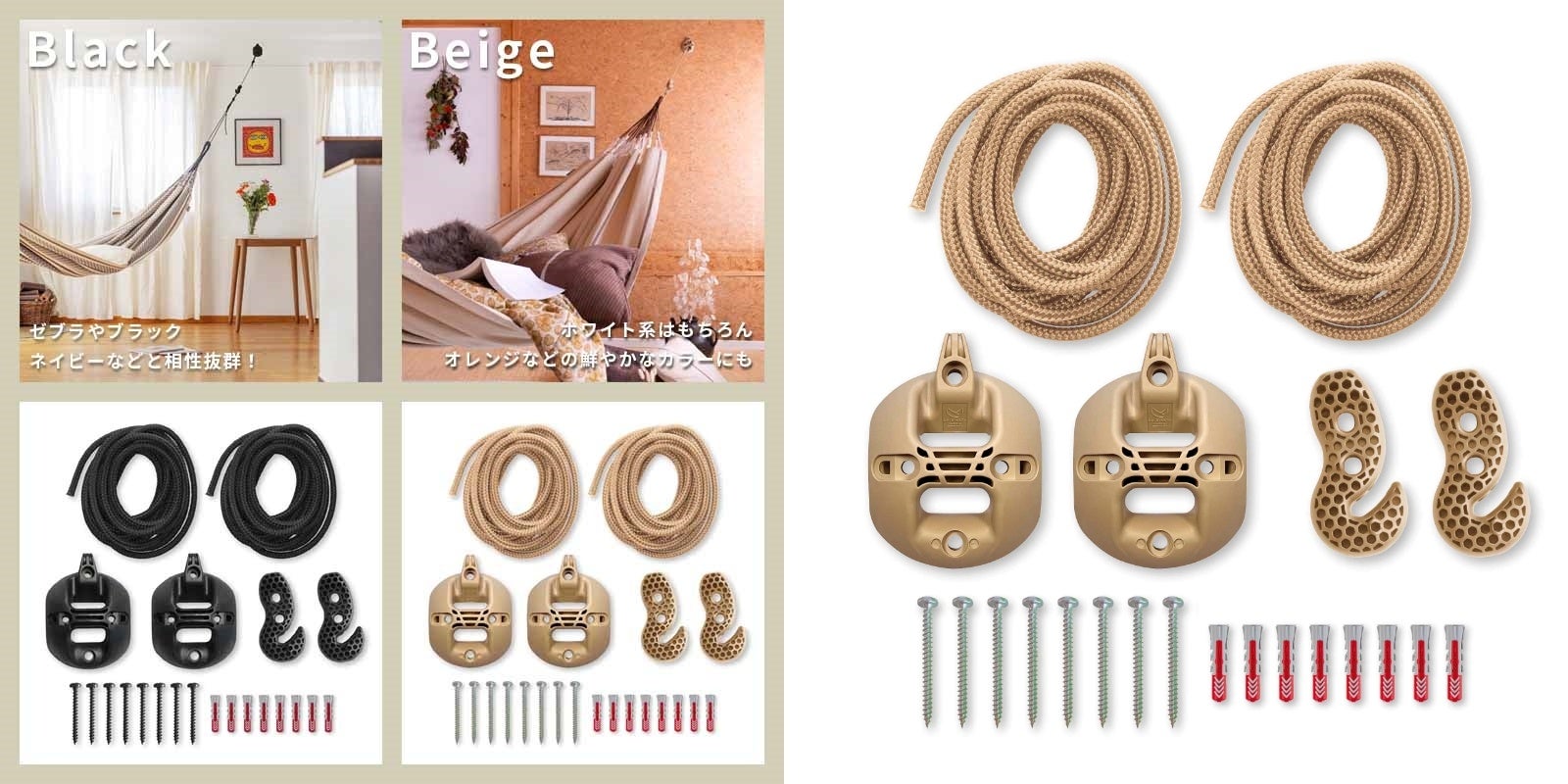 世界50か国以上で愛されているサステナブルなハンモックブランド『 ラシエスタ』からハンモック専用取り付け具に新色が登場。ブラックとベージュの2色から選べるようになりました。