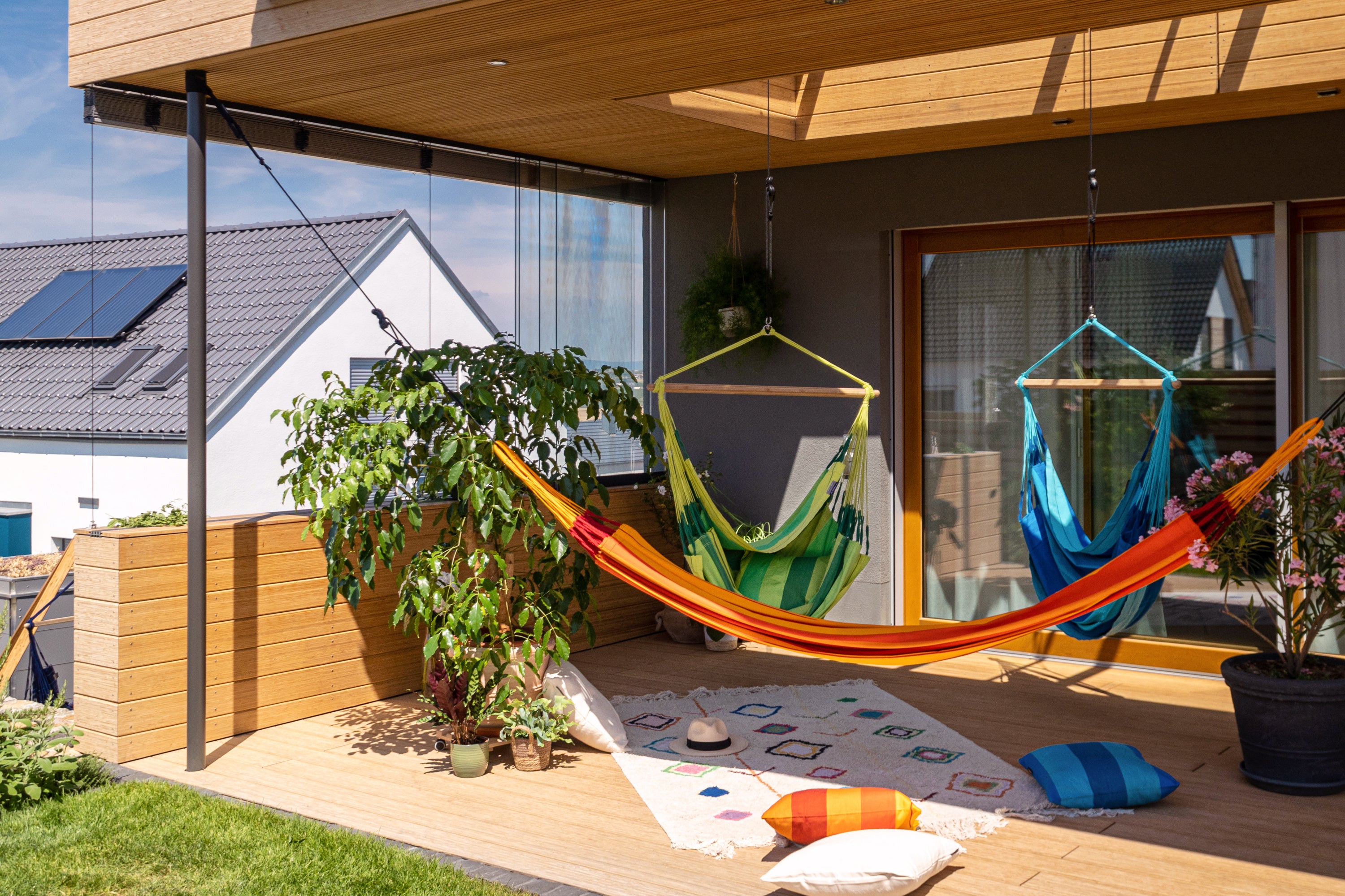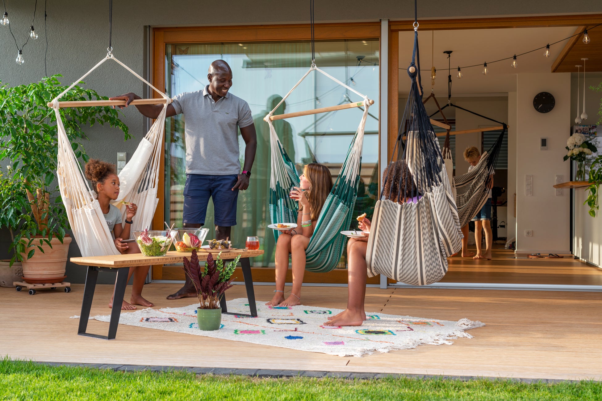 ラシエスタのハンモック専用取り付け具は、品質にこだわり、安全性・使いやすさを最優先に開発されています。耐候性と耐紫外線性にも優れているので部屋の中はもちろん、テラスやお庭など屋外での設置も可能です。