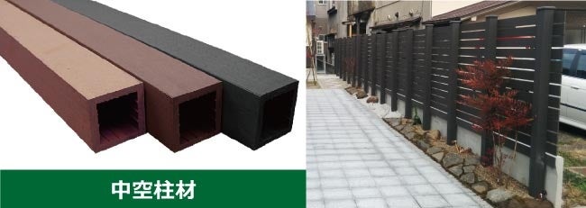 アルミ柱材の化粧材として使用できる中空タイプの柱材です。フェンス柱材をアルミなどにした場合、無機質な印象になりがちですが、中空柱材(L100)をかぶせて固定するだけで、天然木の様なぬくもりを演出できます。トップ部分も専用の蓋を併せることでより自然な柱材に仕上がります。
