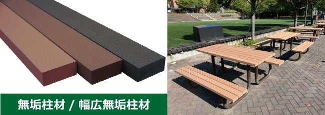 ウッドデッキの根太・束材や、フェンスの柱材、ベンチの座面など様々なものに使用していただいているのが、無垢柱材シリーズです。無垢柱材(L90)は2×4材なので従来ご使用いただいていた2×4材の金具や束石などもそのまま使用できるようになっています。無垢柱材シリーズは構造自体が無垢のシンプルなものなので加工の自由度も高く使用しやすい人工木材です。