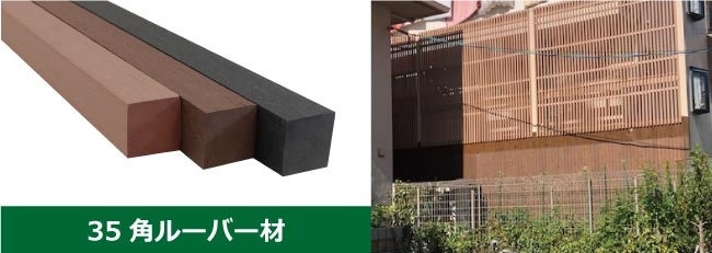ルーバーフェンス用に開発した35mmの人工木角材です。強度・施工性が抜群の無垢使用なのでルーバーとしてだけではなく、濡れ縁や縦格子など様々な用途にご使用いただけます。中が詰まった無垢材なので、切断面も非常にきれいに仕上がり、手間がかかる木口処理も必要ありません!
