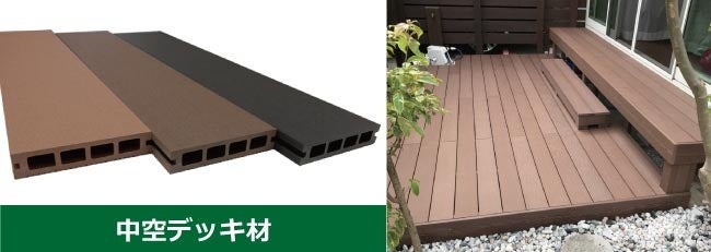 こちらの商品は真板になっており、天然木と同様にデッキ材を上からビスにて固定するタイプの人工木材です。材は表面:柾目模様、裏面:板目模様と木目の模様を変えているので、設置場所の雰囲気に合わせてお選び頂けます。