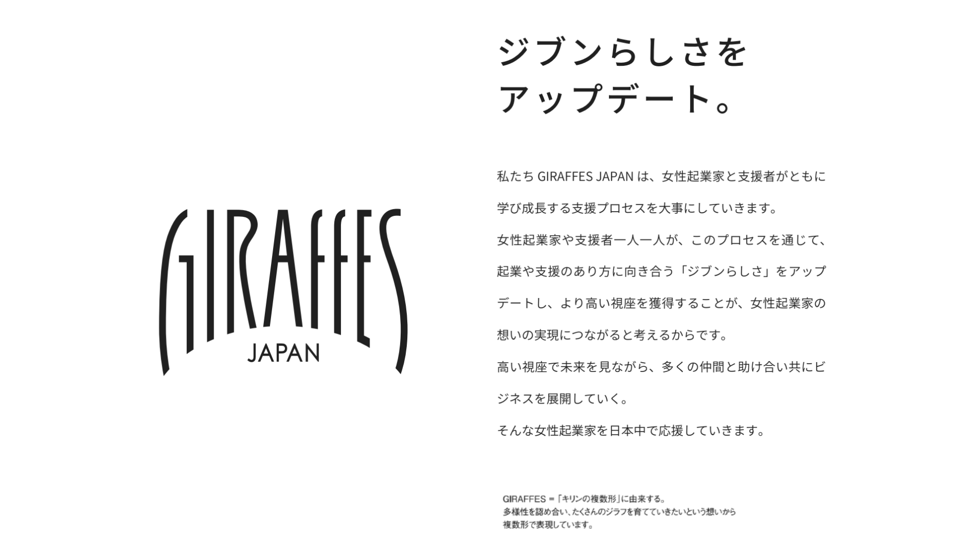 日本各地で身の回りや地域の社会課題の解決を目指す女性のスタートアップが存在しています。こうしたスタートアップを支援することを私たちのブランドコンセプトとし GIRAFFES JAPAN と名付けました。