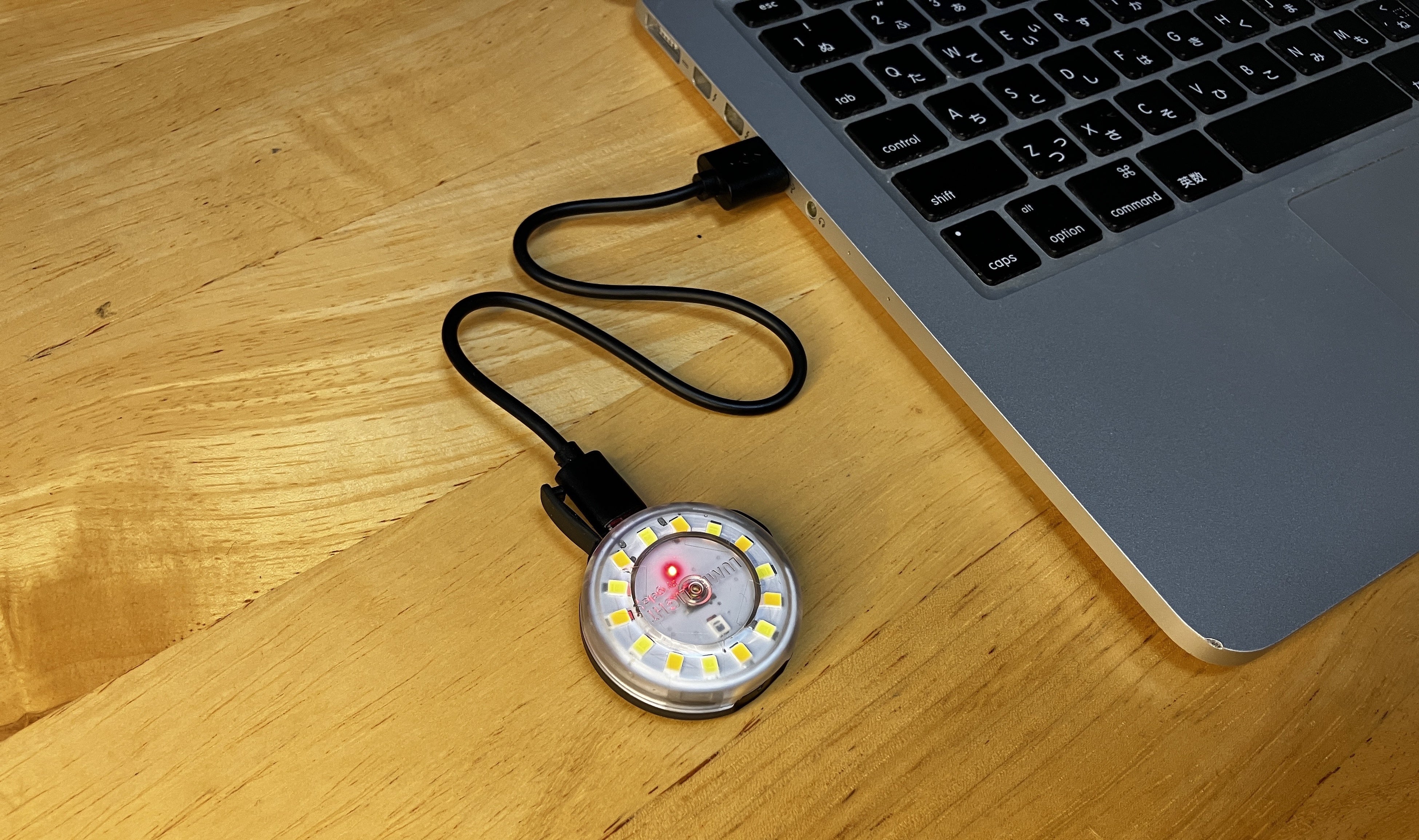GelaLightの中央部分を押せば6種類の発光モードが切り替わります。充電はUSB-Cでどこでも簡単に充電できます!
