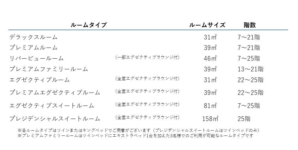 客室はスイートを含む8タイプ全339 室。全室31平米以上のゆとりある広さを持ち、みなとみらいのシティビューを眺望するデラックスルーム、横浜駅側の景色を見晴らすプレミアムルーム、ラウンジアクセスが可能なエグゼクティブルームなど計8種の客室タイプをご用意。