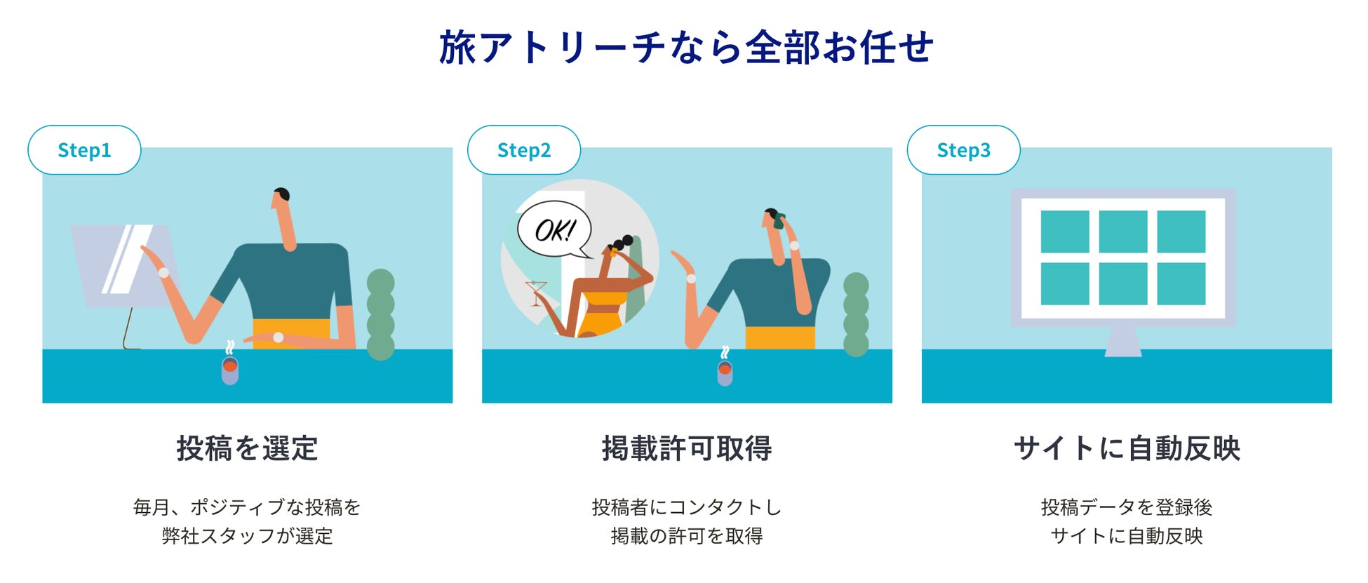 最大の特徴は「旅アトリーチ」が投稿の収集から選定、投稿者の許可取りまで全て行うことです。