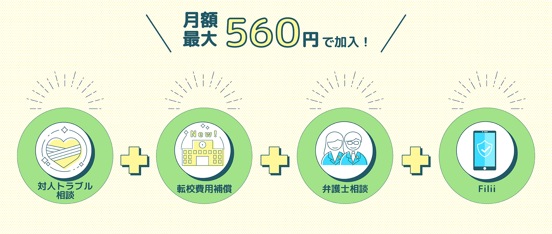 不登校?その前に保険は、臨床心理などへの相談費用と、万が一の転校費用、弁護士相談費用を補償します。