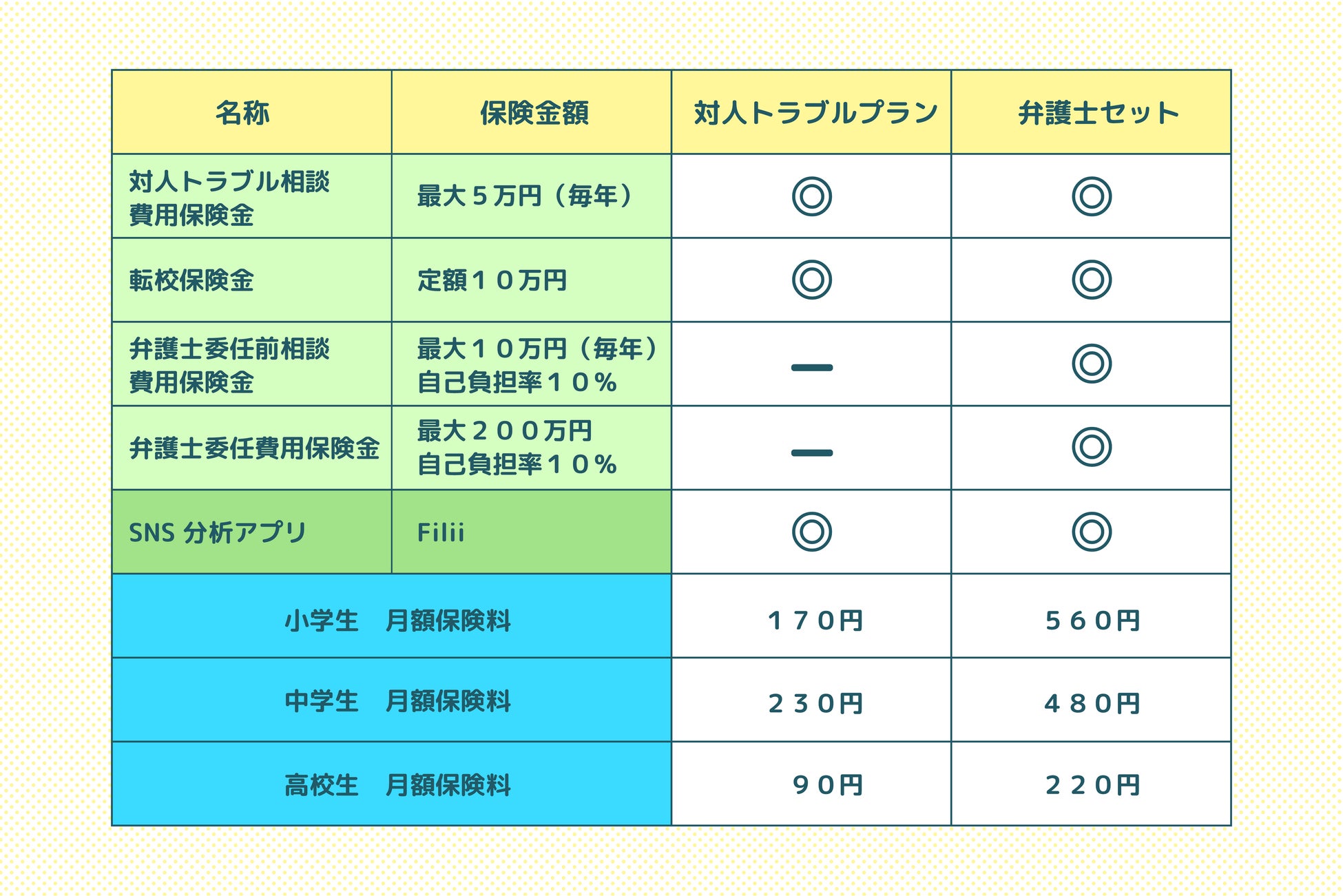 18歳までの子供に不登校、いじめなどの事態が生じた場合に、スクールカウンセラーと同等の職種からのカウンセリング費用を毎年最大5万円、フリースクール等への転校費用を一時金で10万円、そして弁護士相談費用を毎年最大10万円、弁護士委任費用を最大200万円補償します。