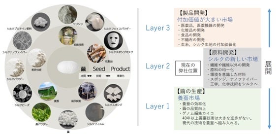 さらに、中長期的には、川上分野である「養蚕」から、川下分野の「製品開発」まで事業展開を進め、絹タンパク素材のトータルサプライヤーへの事業拡大を目指してまいります。