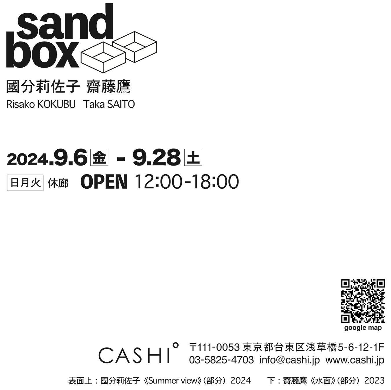 CASHI(東京都台東区浅草橋)にて、アーティスト國分莉佐子(こくぶ・りさこ)、齋藤鷹(さいとう・たか)の2人展「sandbox」を2024年9月6日(金)~9月28日(土)の期間開催します。