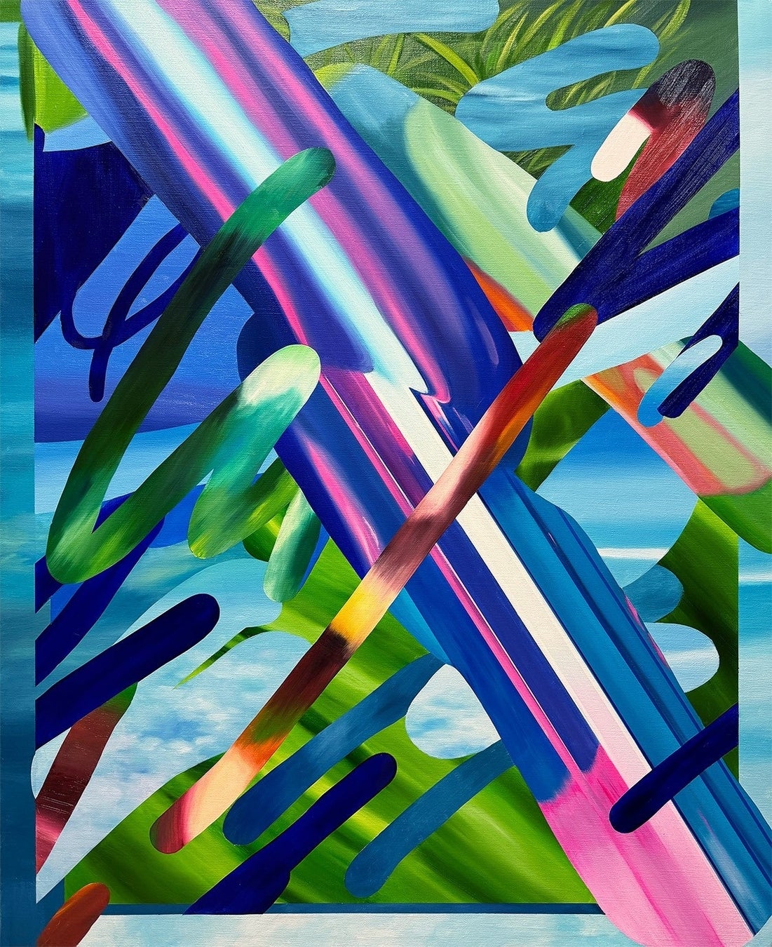 國分は、1999年東京生まれの作家で、ノスタルジックな日常風景や、幼少時代より慣れ親しんでいるゲームのイメージなどを抽象的な形に切り取り、歪め、鮮やかな色彩で描き出す作家です。24年に開催した初個展「可視光線のコンポジション」(Extra Small、 東京)では、映像作品の制作にも挑戦しました。