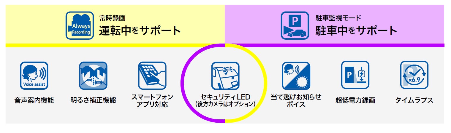 ~セキュリティLED搭載。SDカード寿命表示・操作ロック・Wi-Fi・駐車監視録画も搭載~