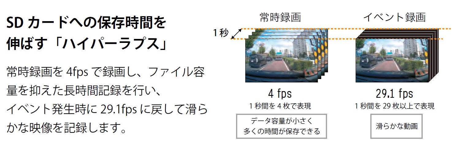常時録画長時間記録モード(ハイパーラプス)使用時、前・後方共に4fps(イベント発生時は29.1fps)